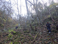 道は未だ落ち着かない。行者堂跡から先で道は沢筋から離れて行く。右手の谷が切れ落ちており、虎ロープのオンパレードである。進んだ後で振り返ると、崖がすっぱりと切れ落ちていた。崩壊地の上を迂回して進んだようだ。