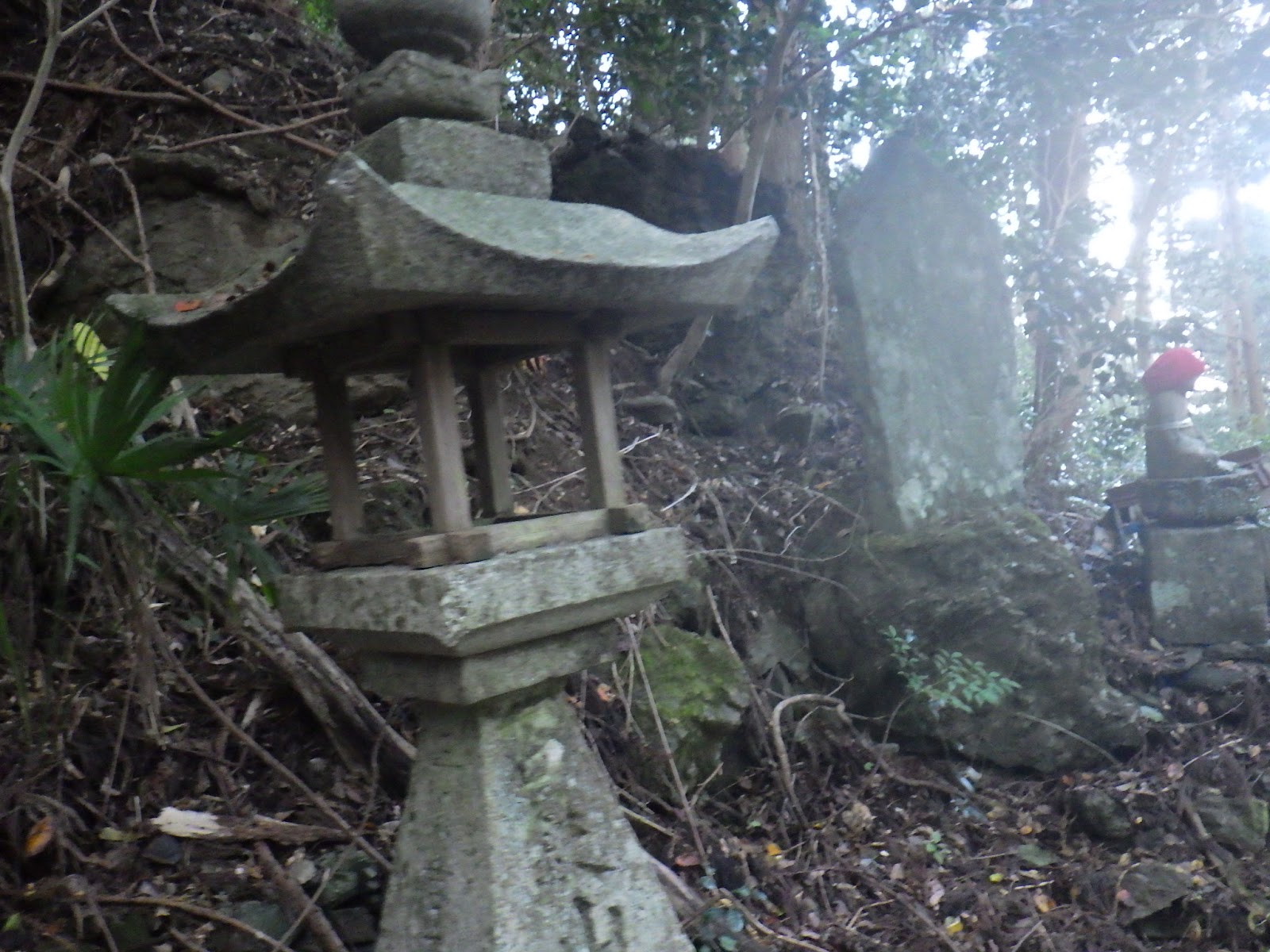 廃屋の地から5分ほど下ると道脇に石鎚山と刻まれた石灯籠が立ち、その傍にお地蔵様と小祠が祀られる。