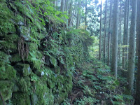 杉林の中を進む。道も結構踏み込まれて安定した頃、道脇に石垣が現れる。そのすぐ先、道の右手、左手に廃屋が残る。上黒川の集落跡だろうか。