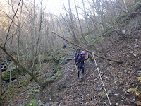 急な斜面を虎ロープを頼りに高度を60mほど下げた後、支尾根を巻くように進み、支尾根を廻り切った辺りで沢を渡る。地形図を見ると支尾根左側に切れ込んだ等高線が見える。そこからの沢水だろう。
