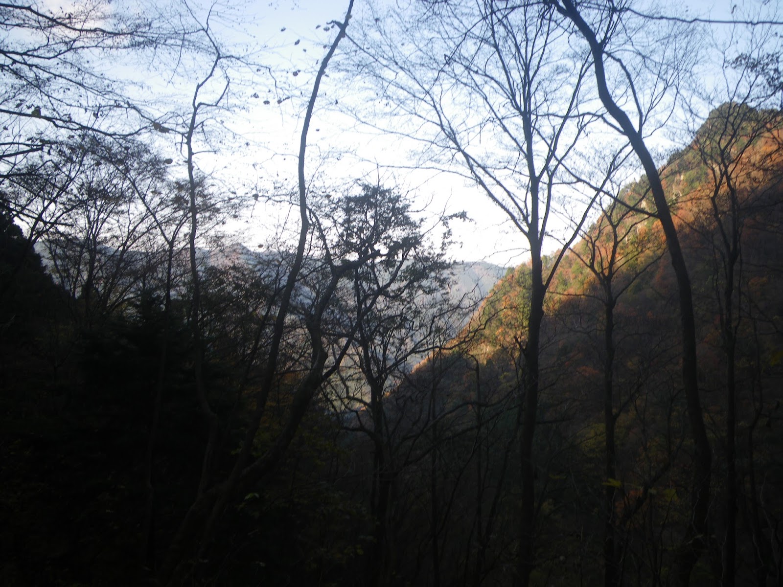 下黒川集落の先もしばらく平坦な道を進み、虎杖(いたずり)に向けて突き出た支尾根を廻りこみ、そこからは等高線を斜め、平行、斜めとゆっくり虎杖に下りてゆく。右手に川が見えてみた。