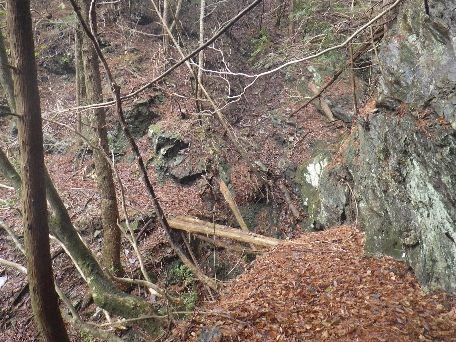 その先で小沢を渡るが、岩場と崖の間の道が狭まり足元が危うい。谷の最奥部に近づくと一瞬、比較的広い安定した道となるが、その先に木橋が架かる。木は朽ちており、沢を迂回。ここも結構厳しかったのだが、最大の難所がその先の下七番谷を渡る箇所に待っていた。