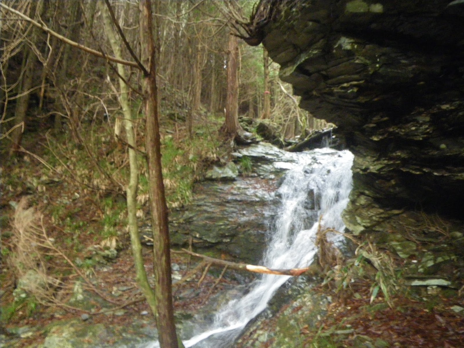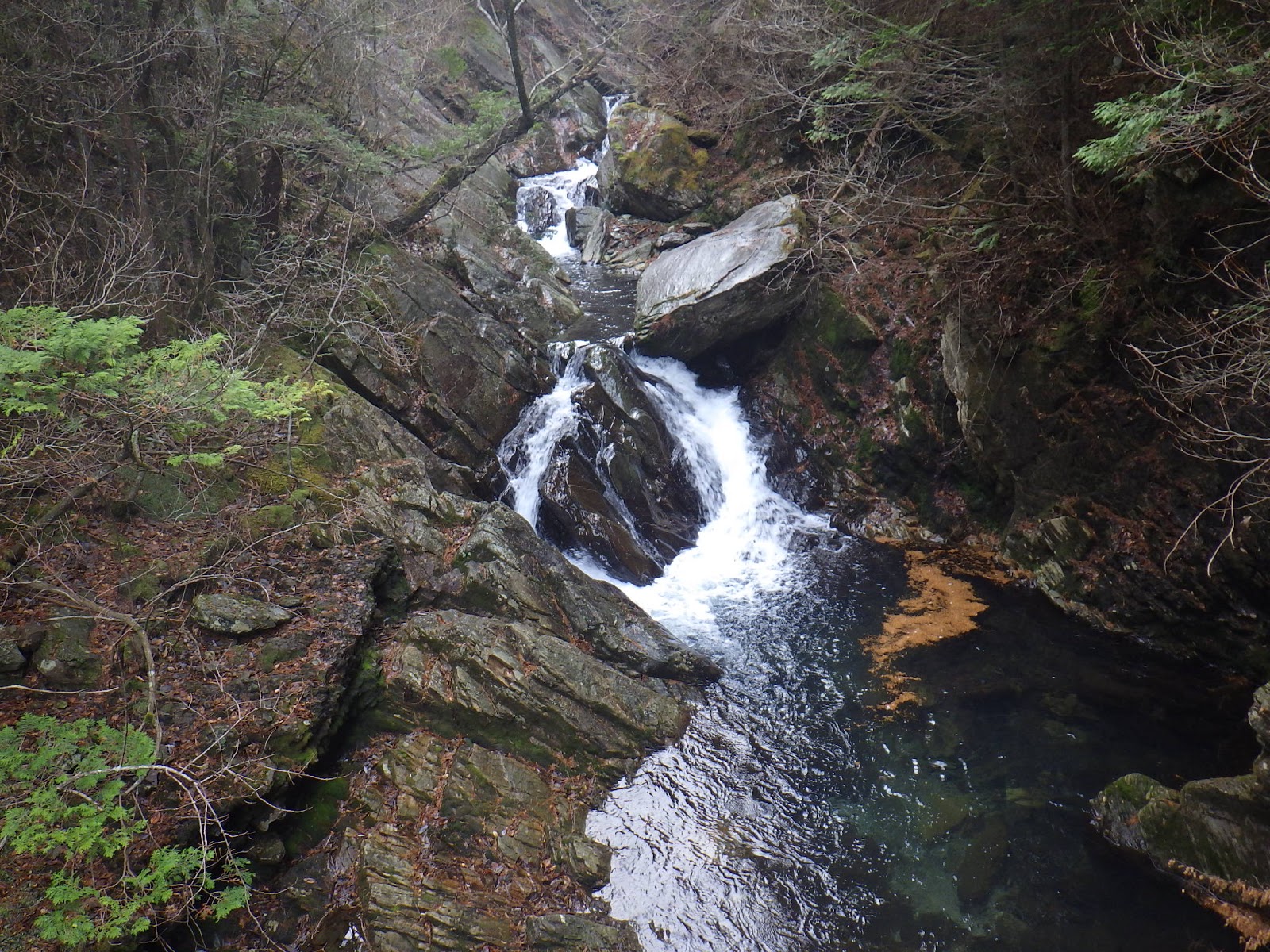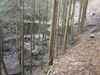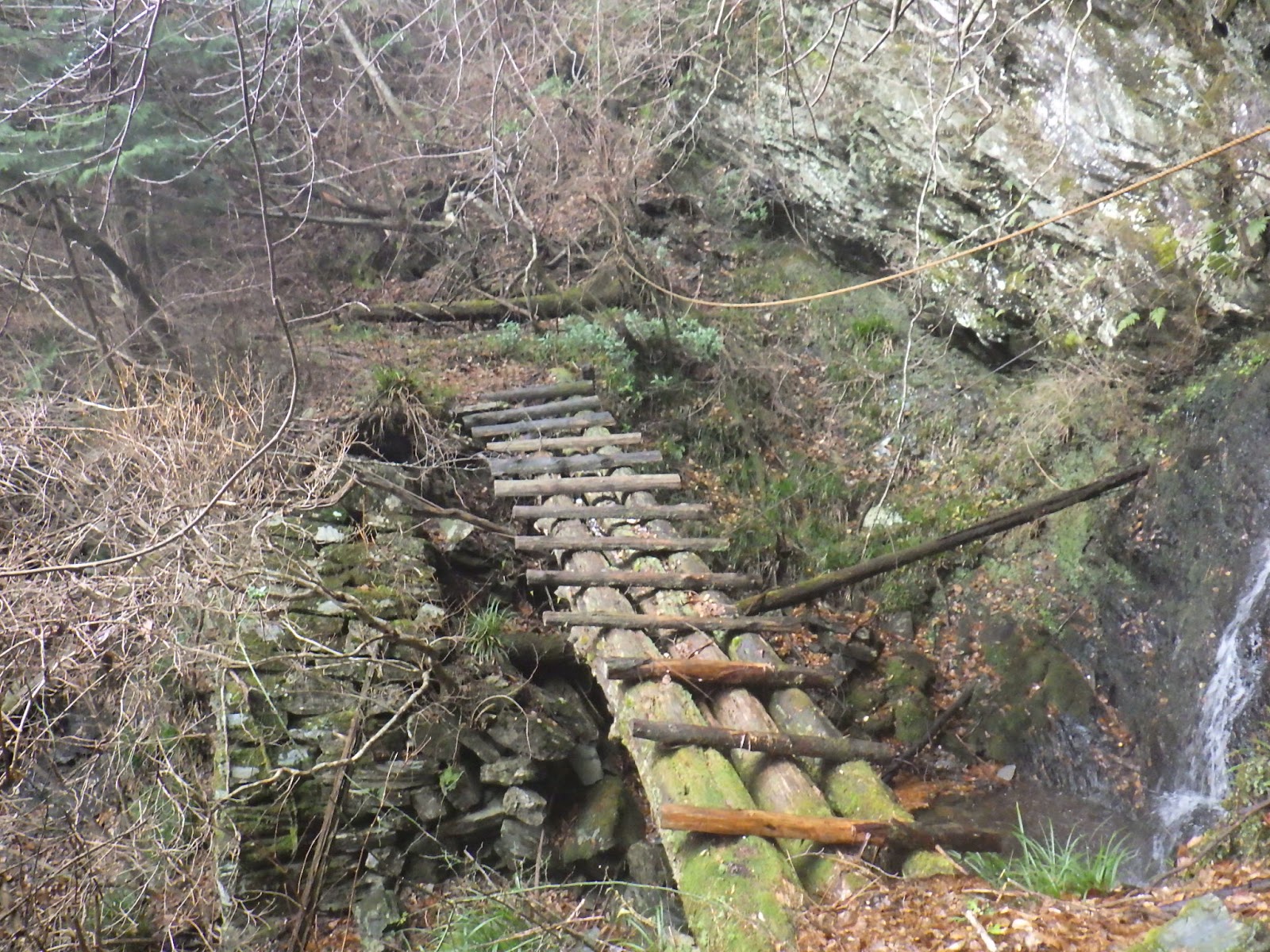 谷最奥部、谷の左岸から右岸に渡る箇所に木橋が架る。木は朽ちており、谷を流れる水量も多く、岩場も滑りやすそう。結局、右側の岩壁に這える木立を見つけ、道の少し上段に上がり木橋の上流部を「高巻」。岩場の木を握り足元を確保しながら進むわけだが、結構緊張した。