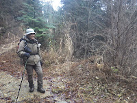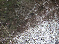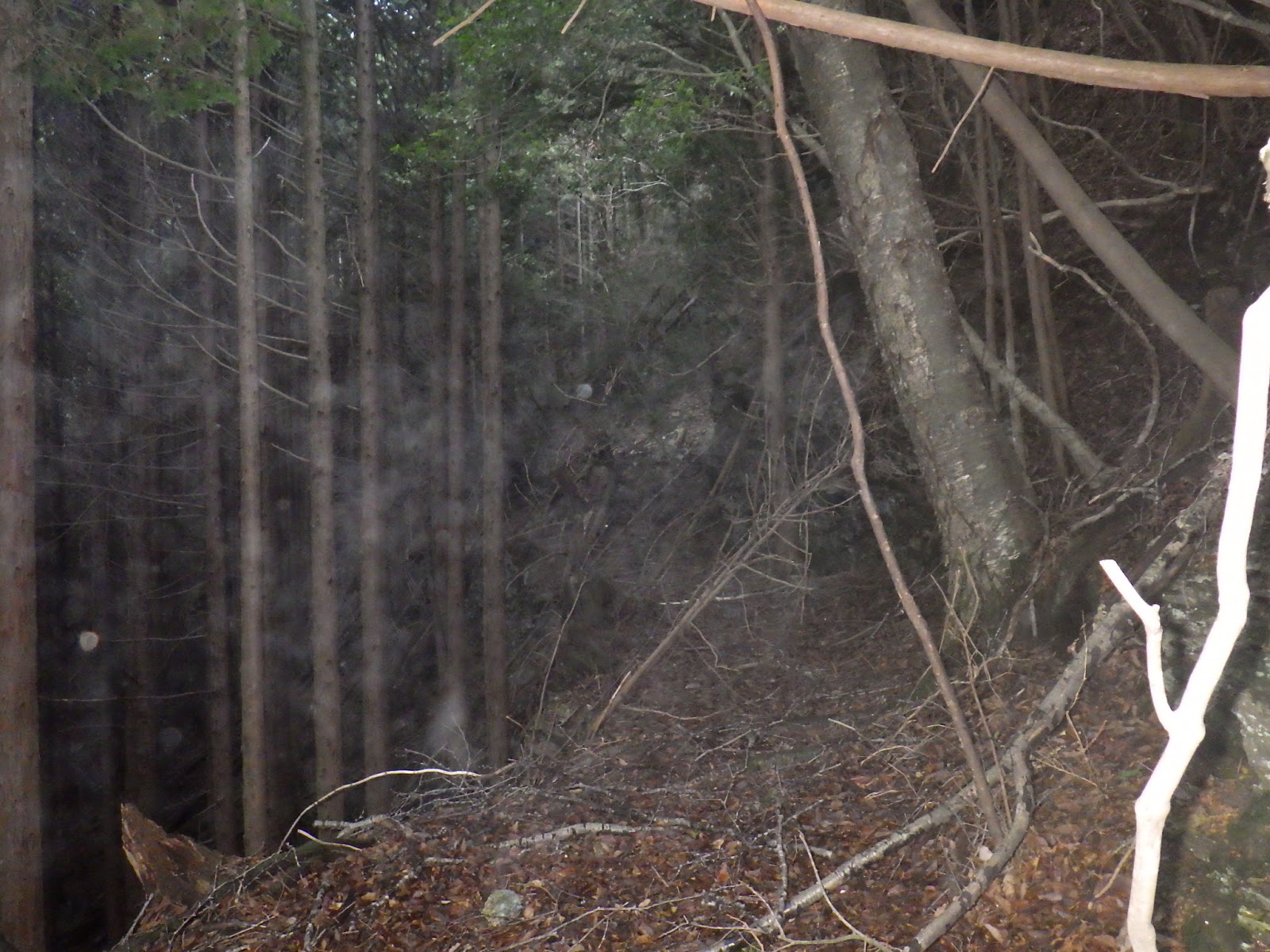 ザレた箇所を越えると植林地帯(15時34分)に入る。暗くて足元が危うい。道は倒木で塞がれる(15時41分)