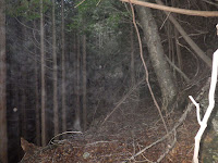 明るくなった道も一瞬で終り再び暗い植林地帯に入る。暗く、そろそろライトを出そうかと思いながら進むと藪に入る。この先、車デポ地まで結構距離がある。さてどうしたものか、と思った時、道は突然林道に当たる。