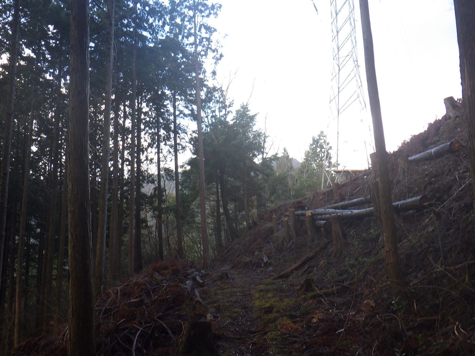 そのすぐ先で道は藪となる。先ほど鉄塔巡視路から外れたわけで、仕方なし。藪を抜け、木立が遮る道を進む。