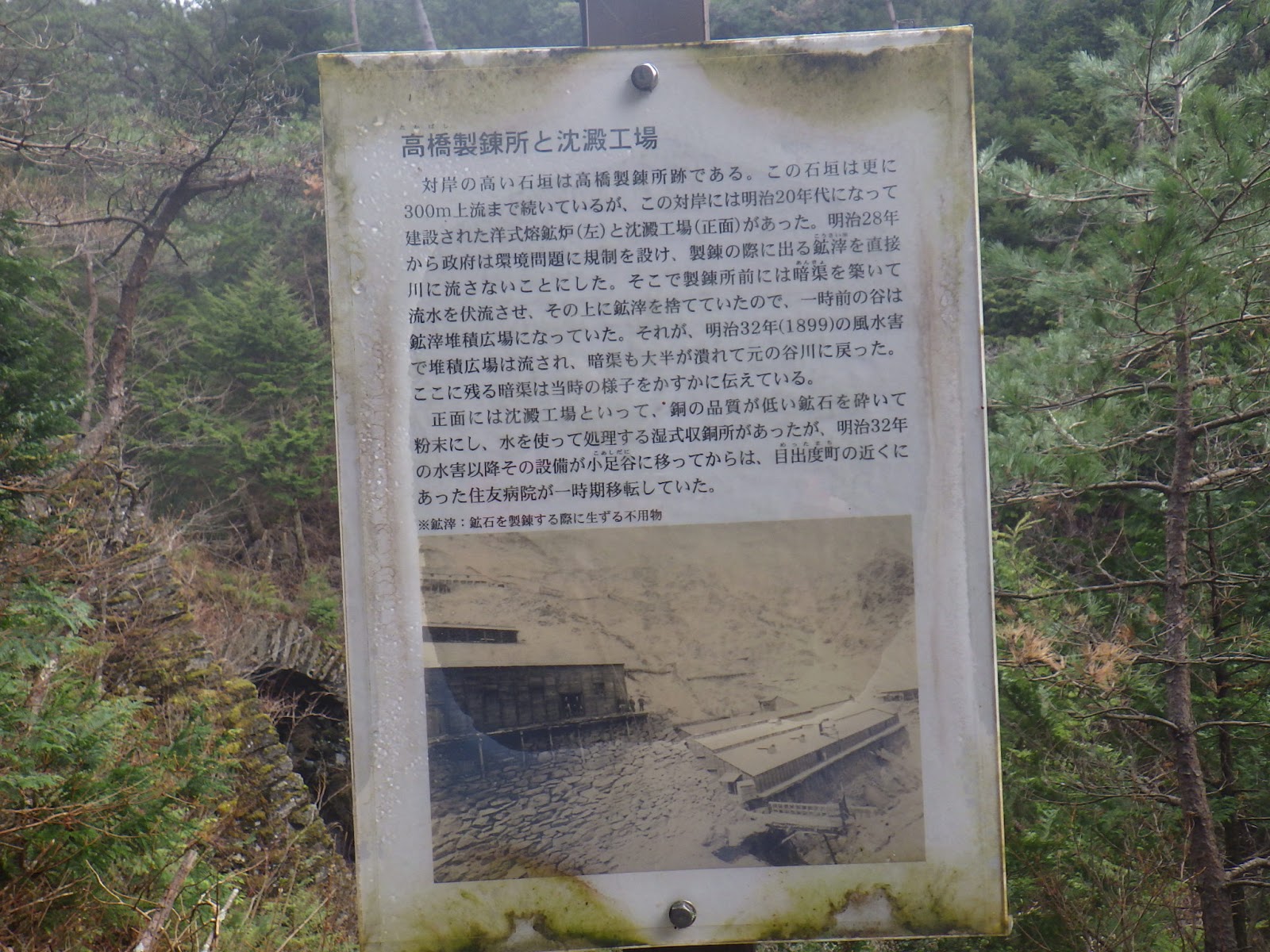 明治10~20年代にかけて対岸の絶壁の上に焼窯という鉱石を焼く所があって、硫黄を取り去った後の鉱石は箱状の桶でこのレベルまで落とし、熔鉱炉に入れて粗銅を採っていた。最盛期にはこの辺り一帯に製鉱課の施設や木炭倉庫がひしめいていた」とあった。