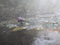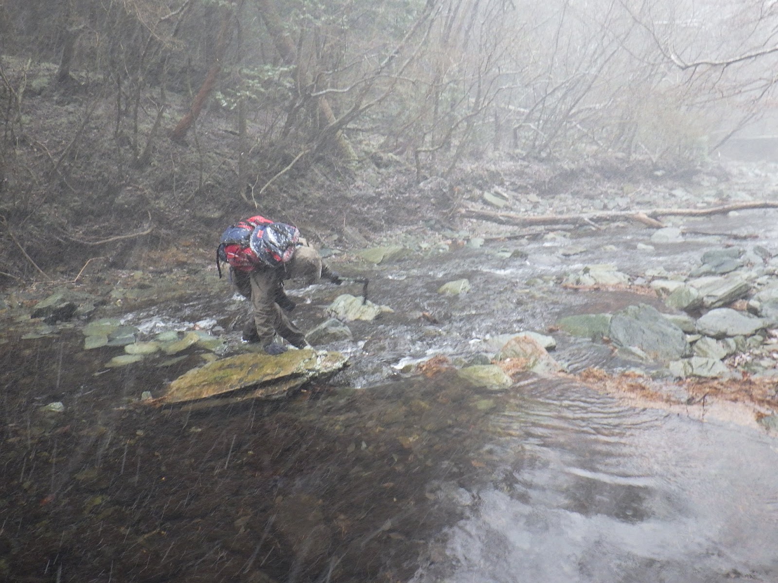 小足谷川右岸に踏み跡を探し、それらしき場所を見つけ河原に下りる。橋はない。雨の翌日ということもあり、水嵩も増している。徒河できそうな場所を探し、河原の岩を投げ込み、飛び石をつくり川を渡る。