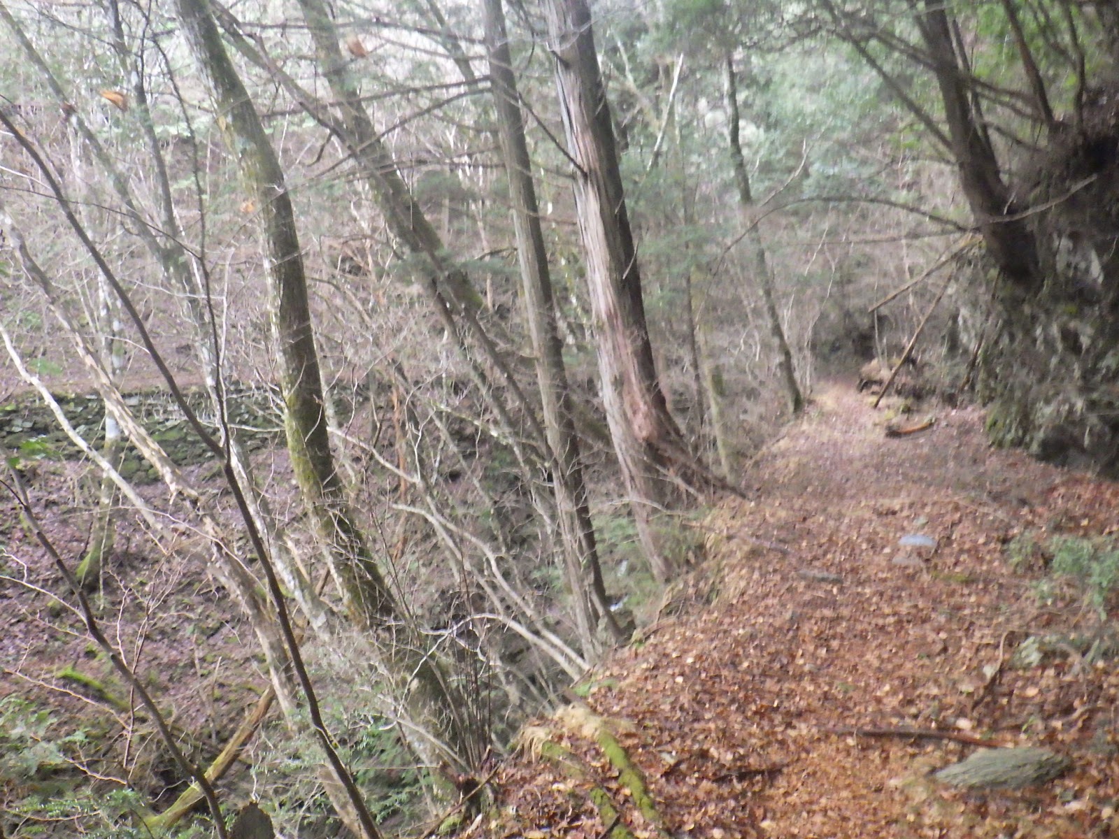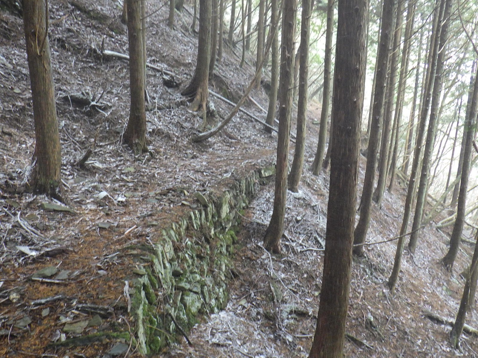 深山幽谷、夏は沢登にいいところだなあ、などと思いながら先に下るとフラットな場所となり、その先は道に沿って石垣が組まれる。坂となっているためか石垣南端は結構な高さとなり、そこに登る石段も30段ほどもある。