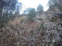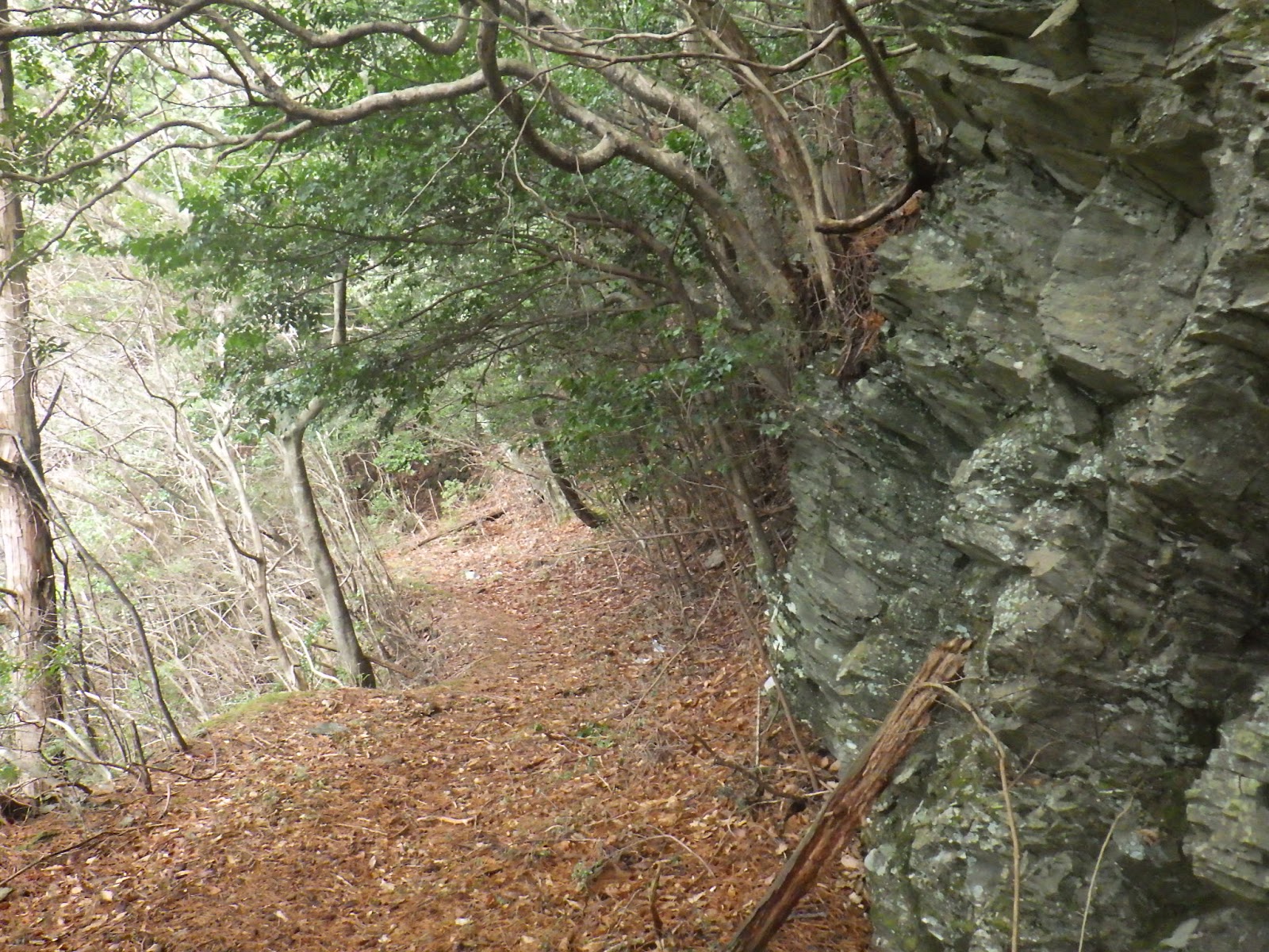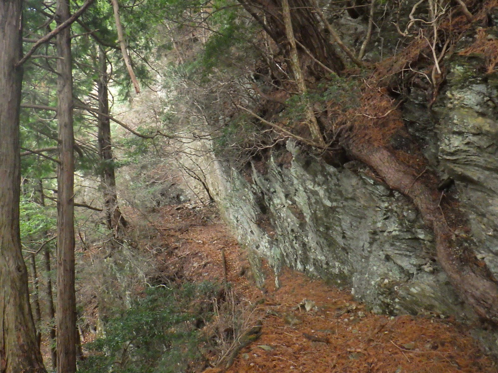 谷迂回のスタート地点は比較的楽な道ではあったが、10分ほど進むと岩壁に沿った細路となる。左手は比高差80mほどの断崖。高所恐怖症の我が身は道に這える草木を握りしめ先に進む。時に左手が開け迂回先の対岸が見えるのだが、先は長い。
