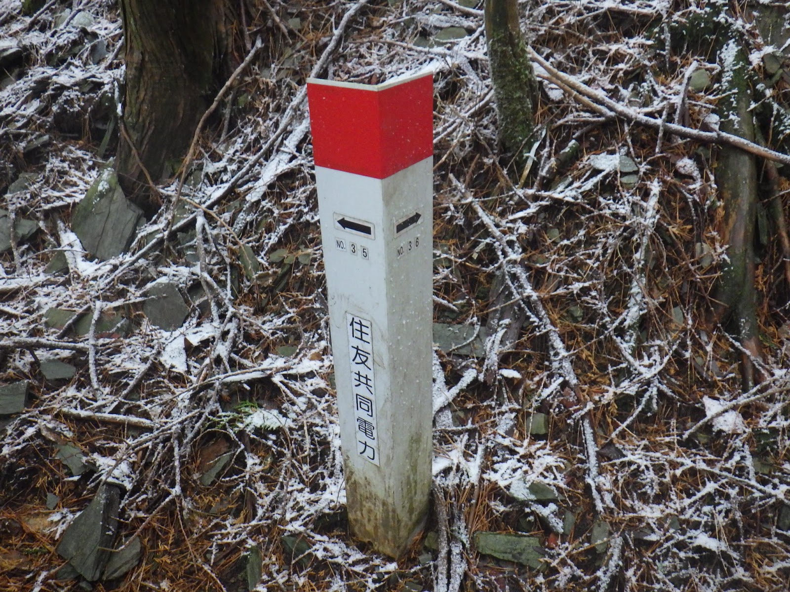 橋を渡ると右手の山が伐採され大きく開かれていた。その先、下七番谷が別子ダム向かって開ける辺りに鉄塔巡視路標識があった。「高萩西線 31 32」と共に別子ダム方向に「30」と記される。地図を見ると、この辺りから県道47号に向かって線が記される。鉄塔巡視路のようだ。