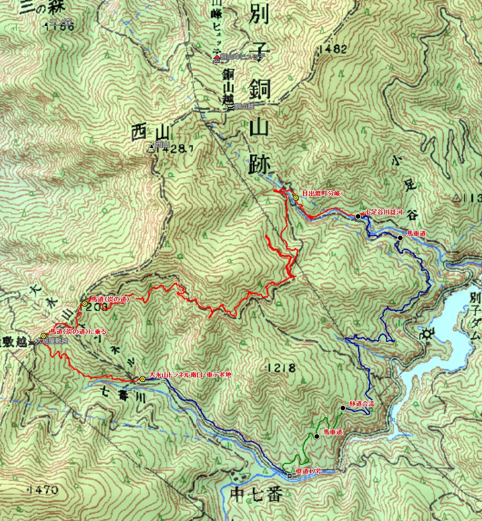本日のルート;銅山峰登山道・目出度町分岐>トラス橋>ダイヤモンド水>高橋精錬所跡>劇場跡>徒河>石組で補強された平坦道に>木橋>朝日谷集落跡>広い平坦地・銅山川筋に出る>お地蔵さま>ロープ付の木橋>平坦地・下七番谷迂回地点>断崖>木橋>下七番谷を越える・最大危険個所>鉄塔巡視路標識>巡視路橋>巡視路橋標識と橋>鉄塔巡視路標識>藪道に>山側が開ける>植林帯に>林道に>県道47号に>車デポ地に戻る