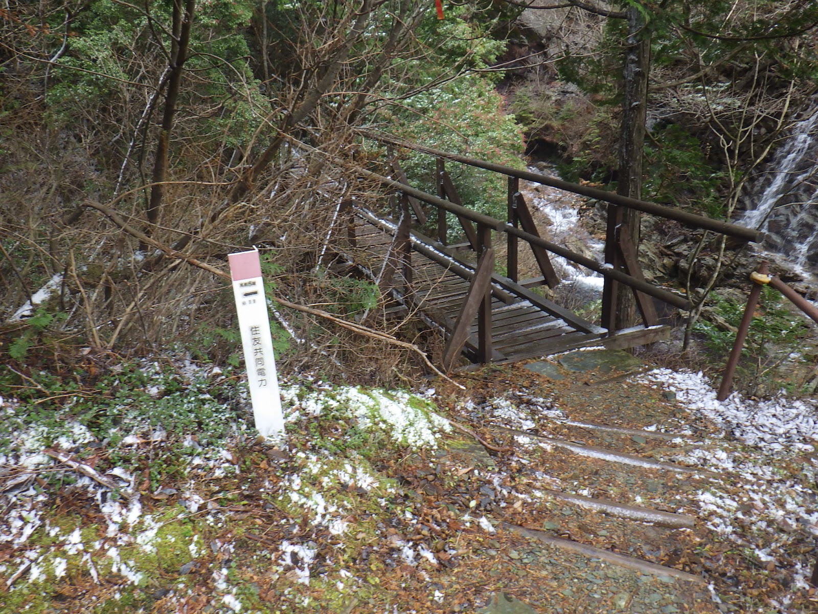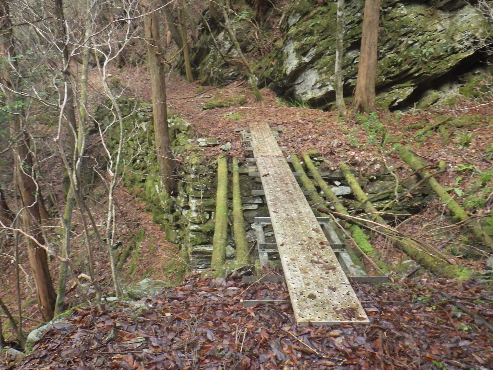 石組で補強された道、左手に崖が迫る細路、右手に岩壁のある比較的広い道など、安定した道を進むと大きな沢が現れ、ロープが張られた木橋が架る。木橋はしっかりしており、ロープをしっかり握り橋を渡る。