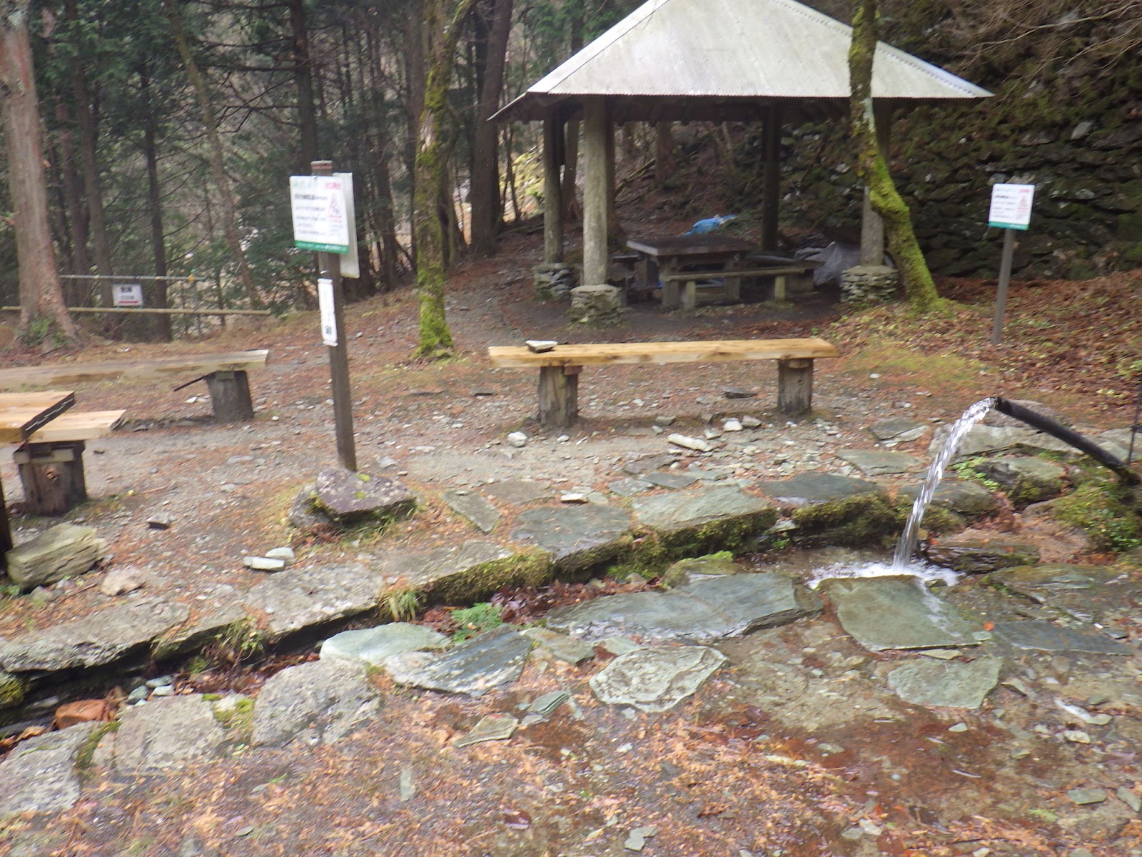 更に数分下り、ベンチや休憩所、お手洗い(冬期は利用不可)のある広場に着く。そこに勢いよく噴出する水がある。ダイヤモンド水と称される。案内には;