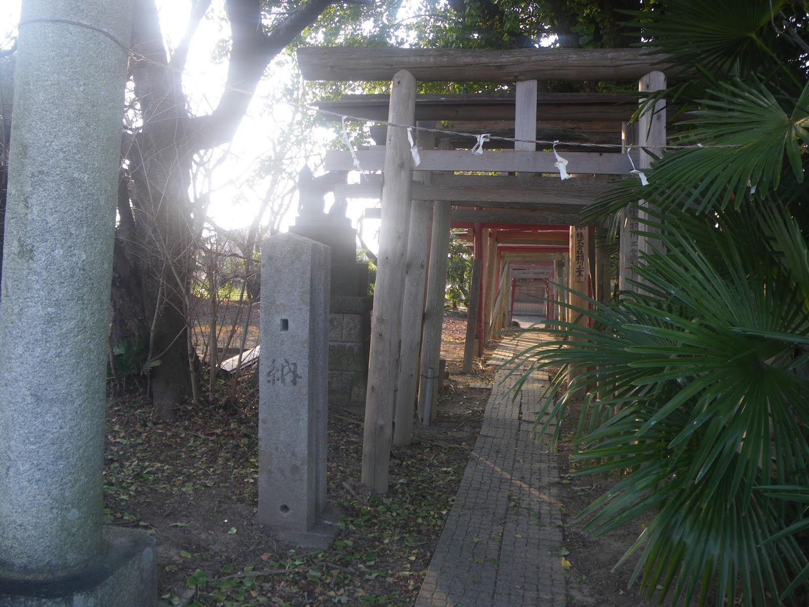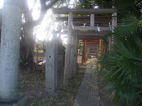 アカマツなどの木々の茂る自然堤防の上を東に歩く。なんとなく砂地っぽい雰囲気もある。志多見砂丘の一端を感じ、一安心。社の西はスパッと自然堤防が削り取られている。河畔砂丘の砂は建設用の砂として重宝され、多くの箇所で削り取られているとのことだが、この地もその例に漏れず、というところだろう。むさしの村で出合えなかった河畔砂丘と出合い、一安心といった気持で会の川筋に戻る。