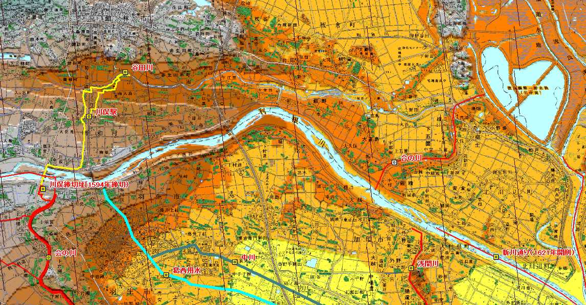 利根川を銚子に流すべく、常陸川、といっても上流部は湿地帯といったものであたようだが、ともあれ、その常陸川筋に繋ぐため佐波から権現堂川辺りまでを開削(「新川通り」と呼ぶ)、次いで、権現堂川辺りから江戸川分流点辺まで(「赤堀川」と呼ぶ)人工的に開削した。