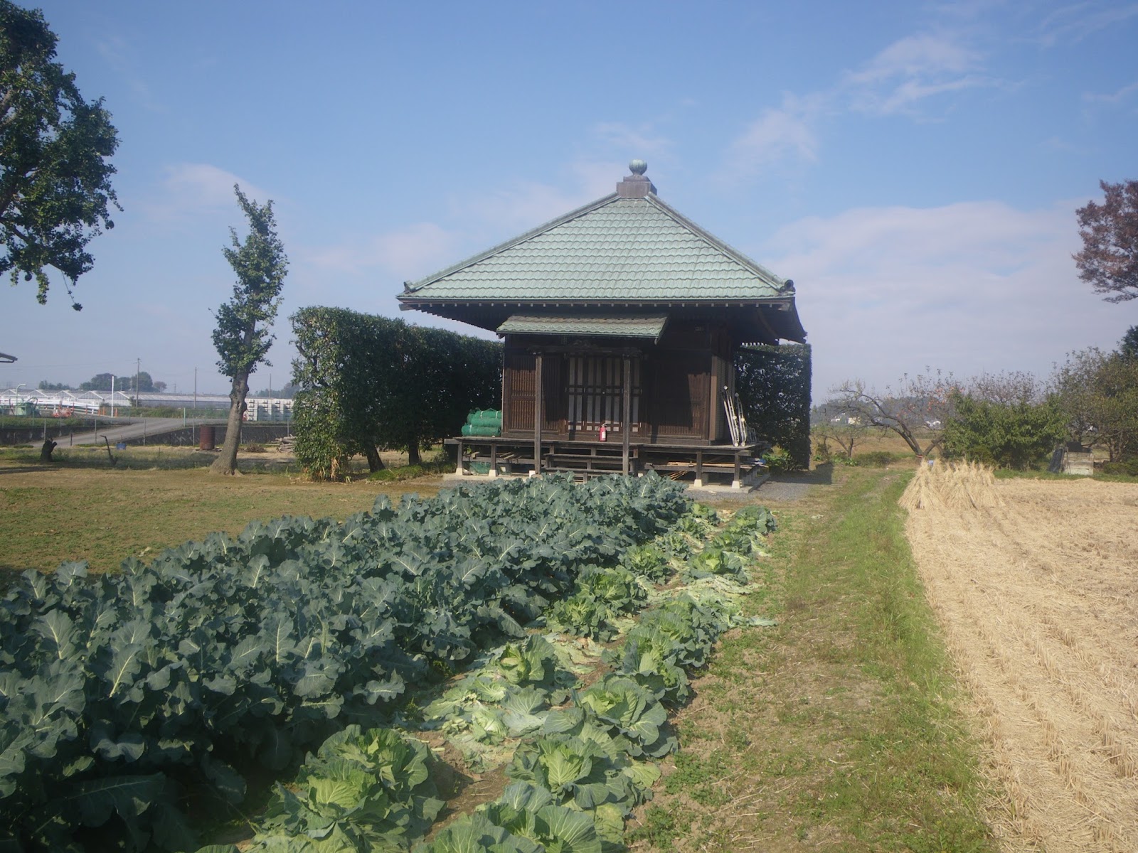 三五詠歌碑の東に稲荷の社と趣のあるお堂が見える。なんとなく民家敷地のようにも思えるのだが、畑の畦道を進みお堂とお稲荷さまに御参りし東に出ると谷田川から南に下る水路に当たる。