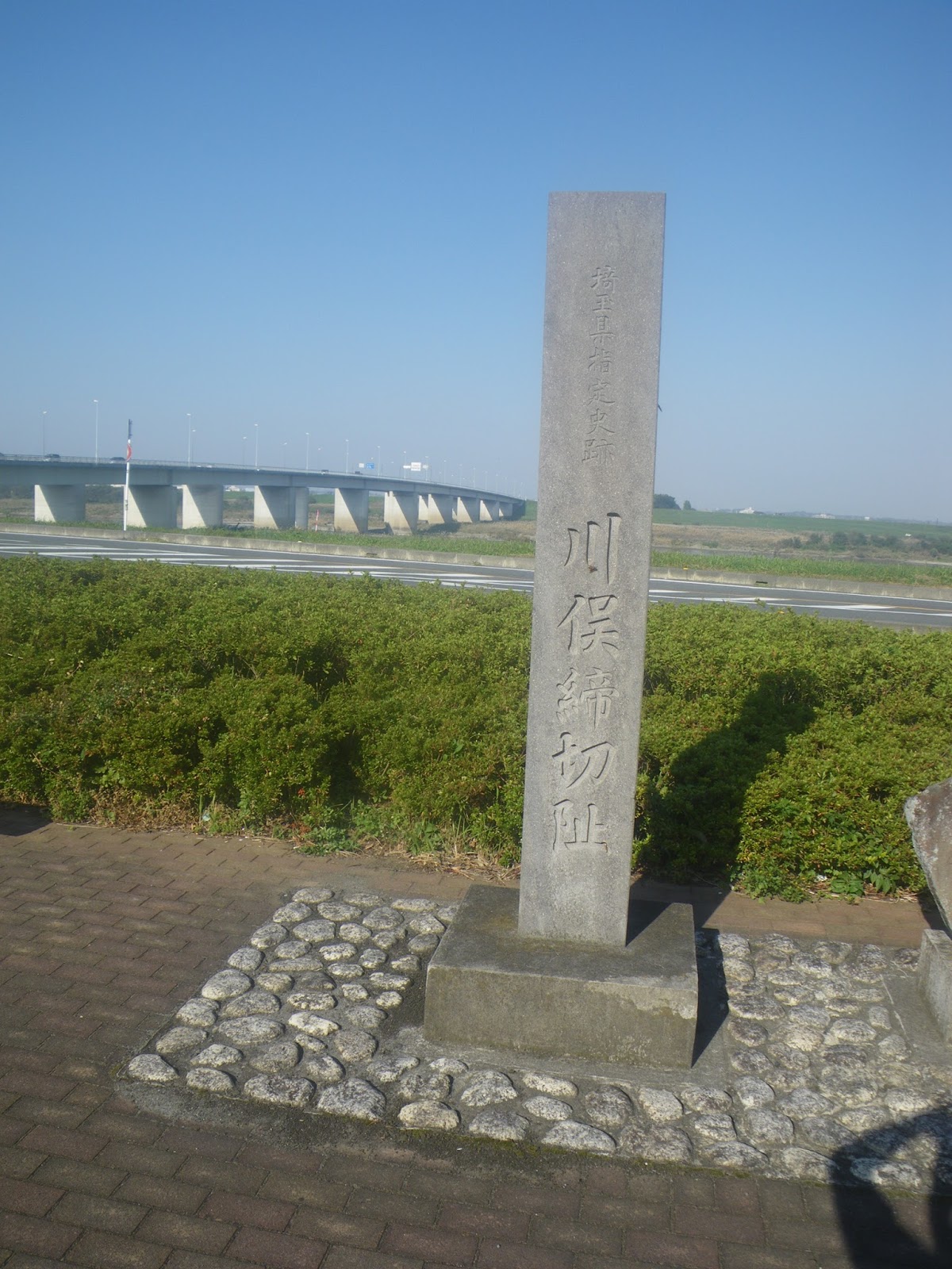 昭和橋を渡ると南詰めに「道の駅 羽生」がある。広い駐車場の東にある情報コーナー兼休憩所の建物と堤上を走る道路の間の広場に「川?締切跡」の石碑が建っていた。戯れに川俣駅まで進んだため、本来のスタート地点である会の川締切跡に戻るまで、おおよそ2時間かかってしまった。