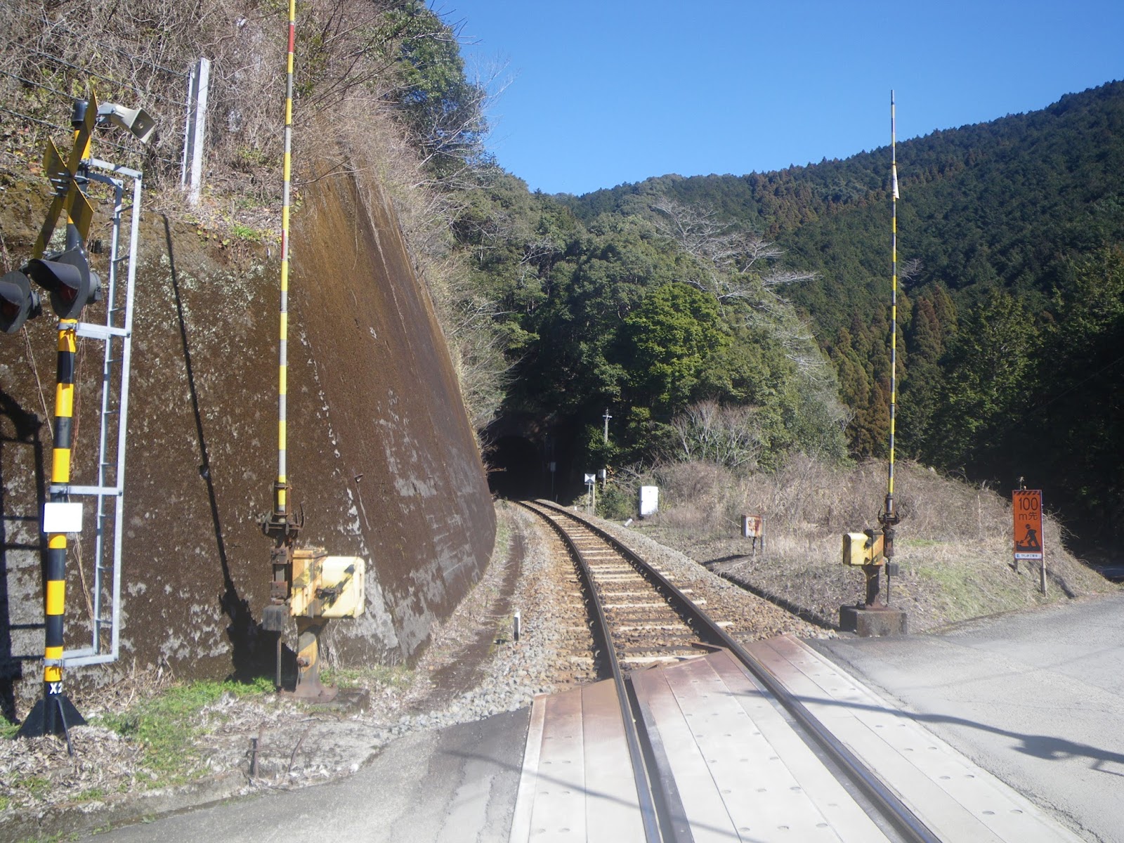 谷を上り峠に向かう途中で線路を横切るが、その右手にはループを抜け、窪川方面に向かうトンネル、左手には川奥信号場。予土線・家地駅からトンネルを抜けてきた予土線の線路と、ループトンネルを抜けてきたくろしお鉄道中村線の線路が合わさる。ここで列車の交換・退避がおこなわれるのだろう。