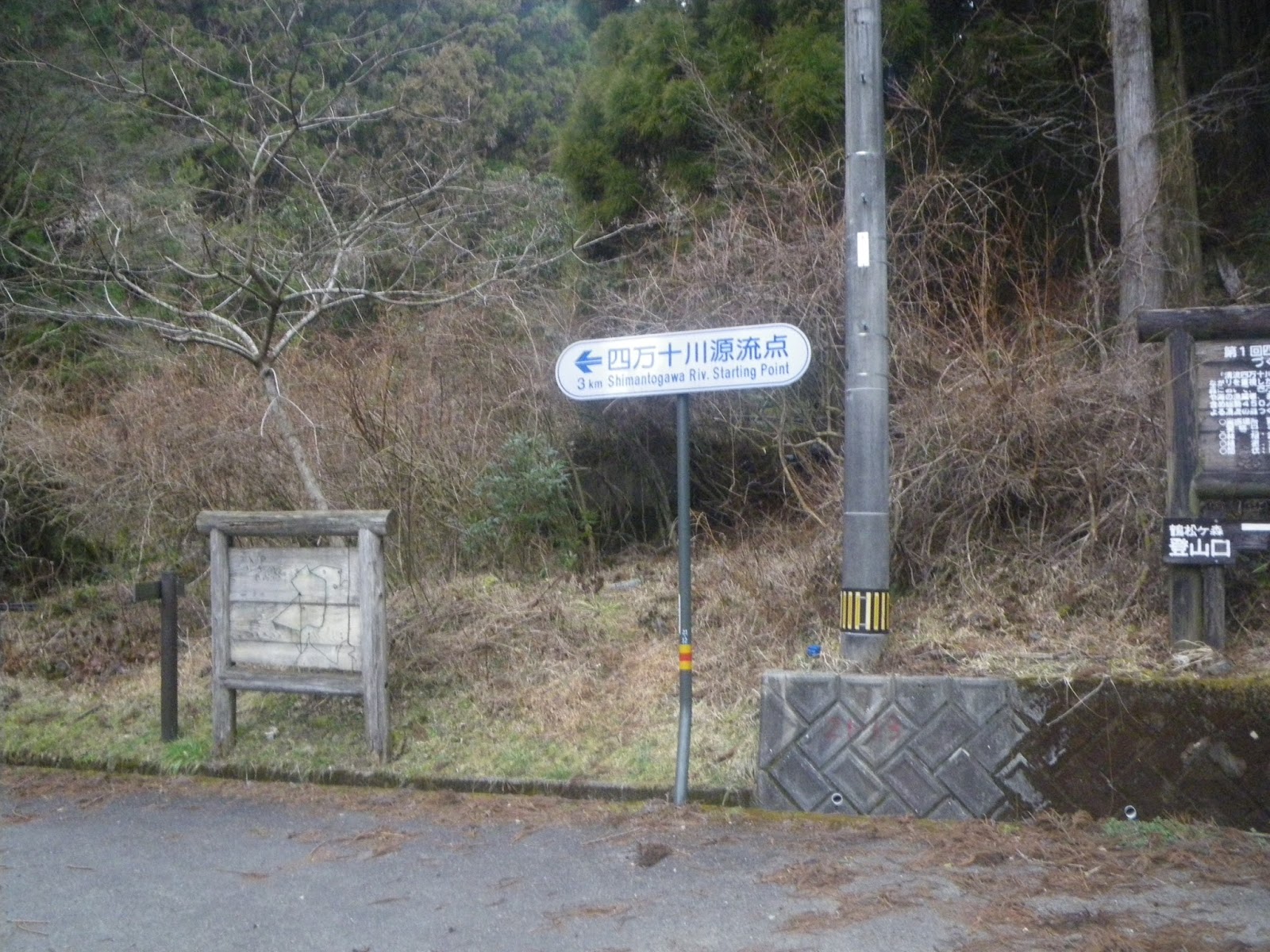 道を10分強走ると県道脇に「四万十川源流点 3km(左)」の標識と、「鶴松ヶ森登山口(右)」の標識が立つ。標識前は結構広いスペースがあり、ここにデポするかどうかちょっと悩む。この先の源流点への道がどのようなものかわからないが、「えいや」の気分で車を先に進める。