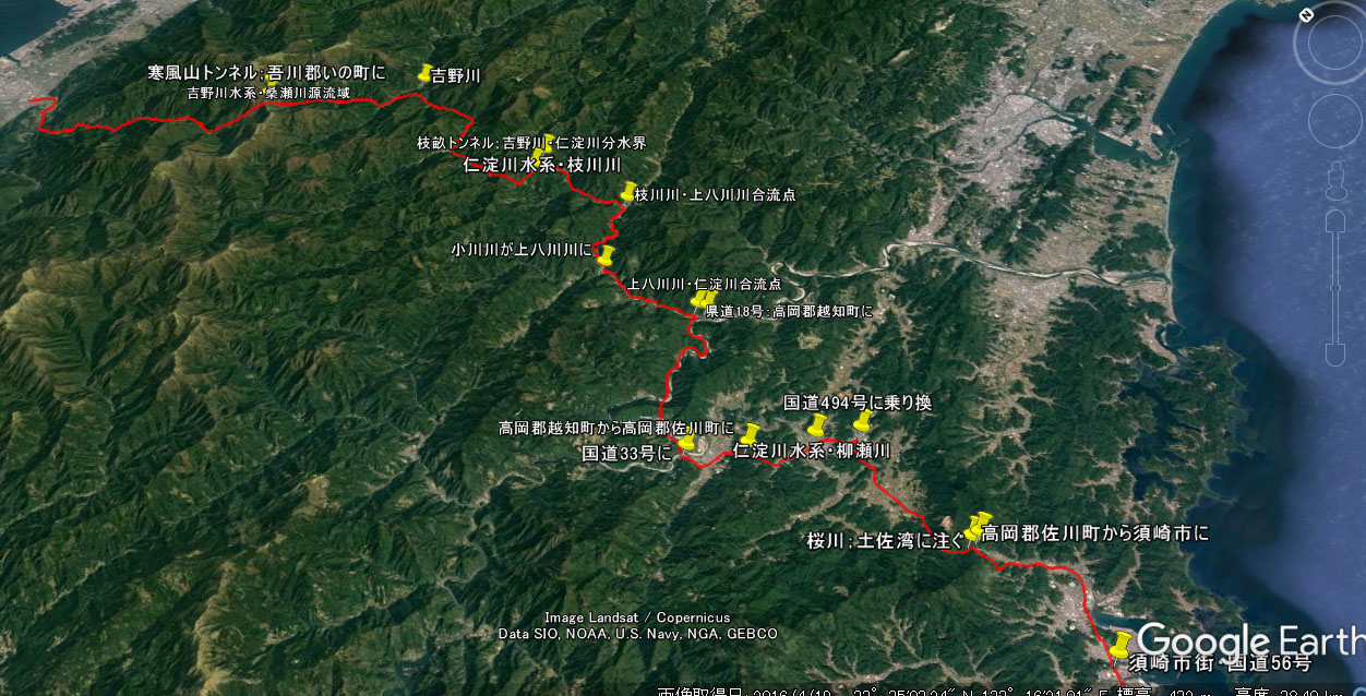 国道494号;高岡郡佐川町から須崎市に。水系は土佐湾に注ぐ桜川となる
