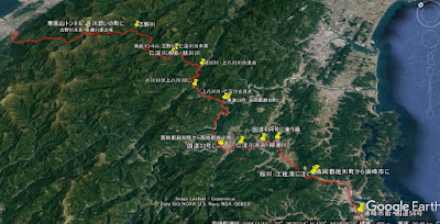 峠からは仁淀川水系・長者川に沿って谷筋を下り、大渡ダムの少し下流で仁淀川本流に合流した川筋を少し下り、仁淀川左岸に渡り国道33号に合流。
