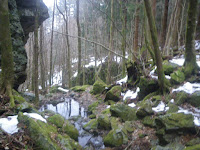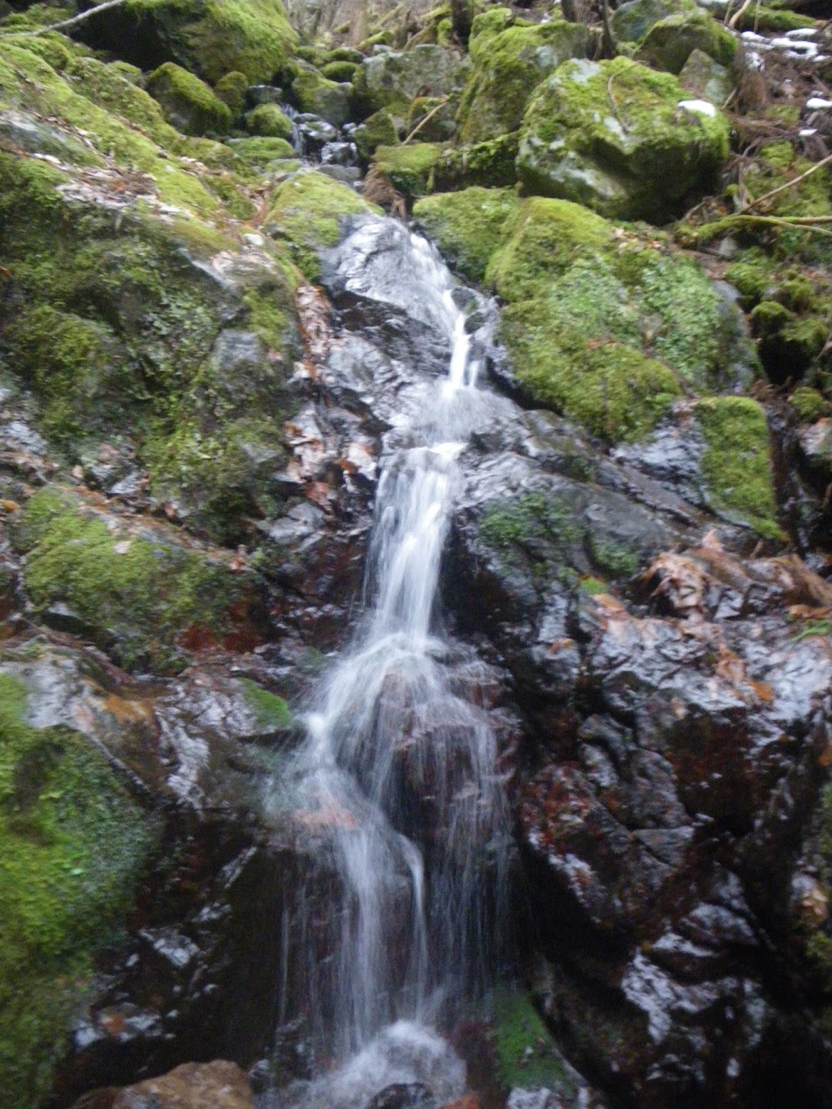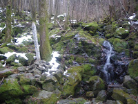 源流点から成り行きで下ると、沢の左岸に「帰路」があり、途中までは岩場を下ることはなかった。途中、岩場を渡り沢の右岸を下り登山口に戻る。これで、本日のメーンイベントは終了。凍結した道を車デポ地まで戻る。