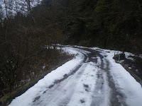 快適に尾根筋へと上っていったのだが、尾根筋手前で路面凍結。結局元に戻る。戻る途中の路面も、上るときはわからなかったのだが、結構凍っているように見えた。