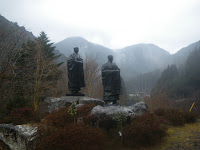 県道378号を源流点登山口への分岐点まで戻り、四万十川に沿って少し下ると道脇の小高い塚に像が立つ。ちょっと立ち寄り。四万十川の源流域を背景に二体の像が立つ。