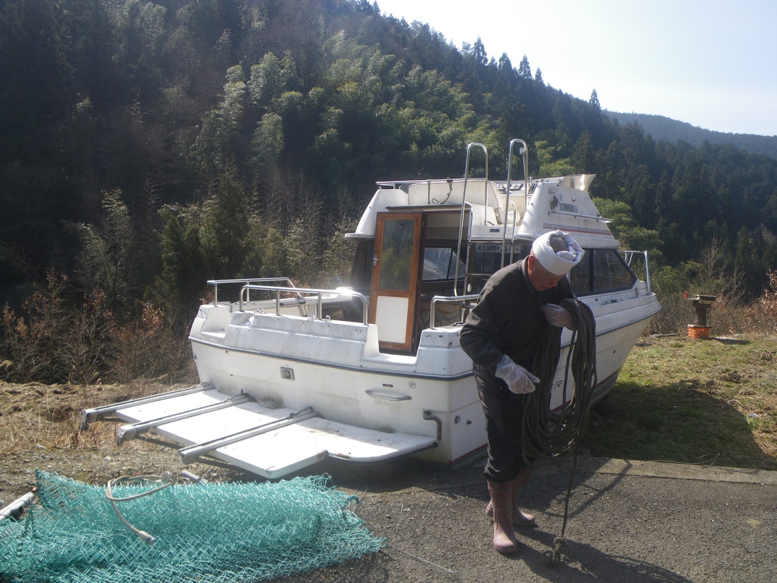 先に進むと道脇にクルーザーが置かれている。傍にいた方に聞くと、海に遊びに行くこともなくなったので、ここに置きお遍路さんの休憩所にでも、とのこと。しばしお話をさせて頂き、その先杉林に覆われた細い舗装道を抜けると車数台が駐車できるスペースがあり、そこで舗装が切れる。
