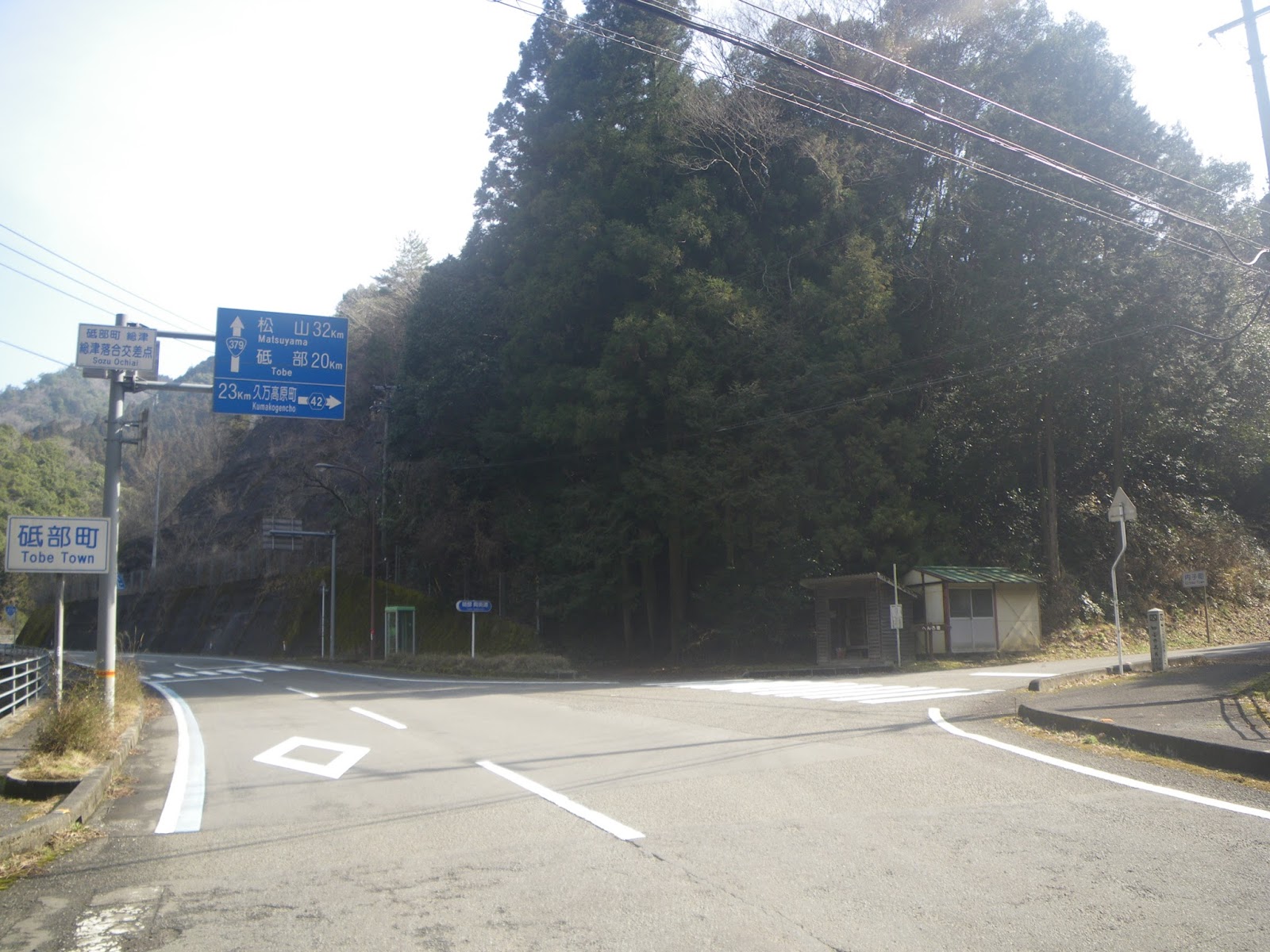 この地が遍路道のルート分岐点。左に国道379号に沿って北上すると下坂場峠、鶸田峠を越えて久万に向かう道、右に小田川に沿って国道380号を進むと真弓峠、農祖峠を越えて久万に向かう道となる。