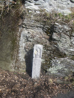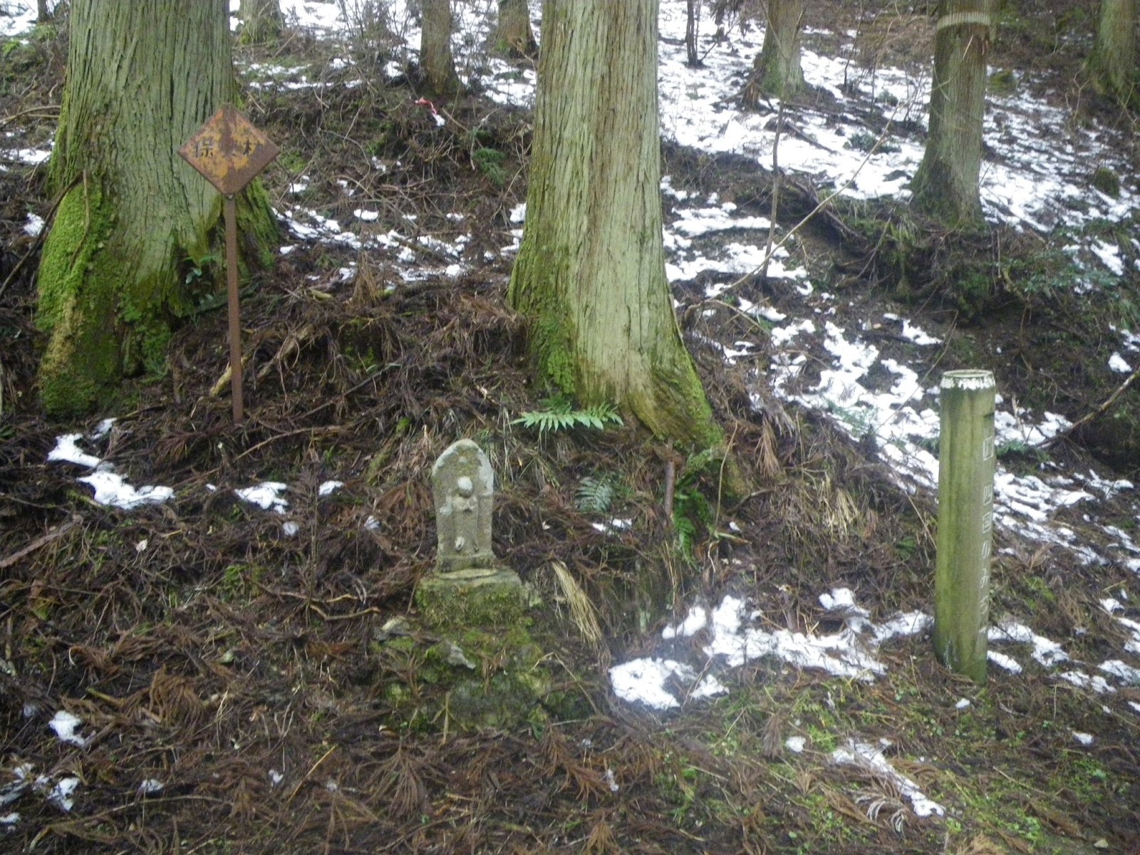 舗装された町道を2分ほど下り、遍路道の案内に従い道を左に沢に沿った山道に入る。2分ほど進むと沢脇、木の下に地蔵尊が佇む。道標らしきものはない。さらに3分ほど下ると2基の地蔵尊と道標らしき石標が立つが、文字もなにも摩耗している。これが「奥の地蔵尊」? 傍には「鶸田峠 1㎞ 久万高原町役場 1.8km」の木標が立つ。
