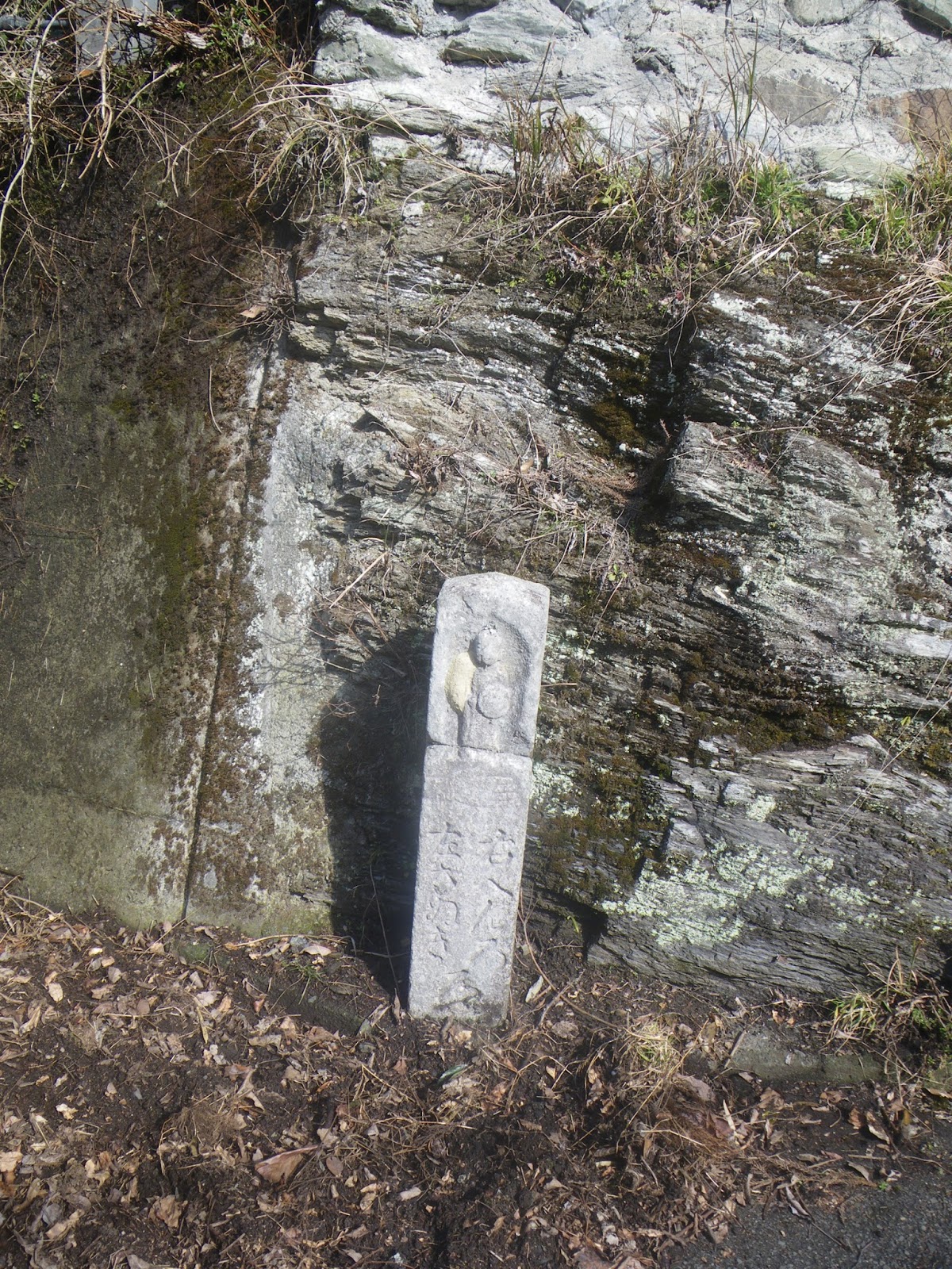 旧道を走ると「えひめの記憶」に記されるように、岩肌にミニ霊場の舟形石仏や馬頭観音、地蔵などが祀られていた。舟形石仏は舟形の石に一体の仏が刻まれている。観音様が多いようだ。