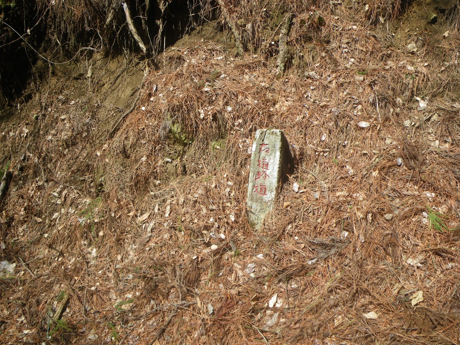 杉林の土径を数分進むと、右手の沢に向かって下る角に道標が立つ。草に隠れ少しわかりにくい。道標には朱で「右 遍路道」と書かれているが、いたずらなのだろうか。