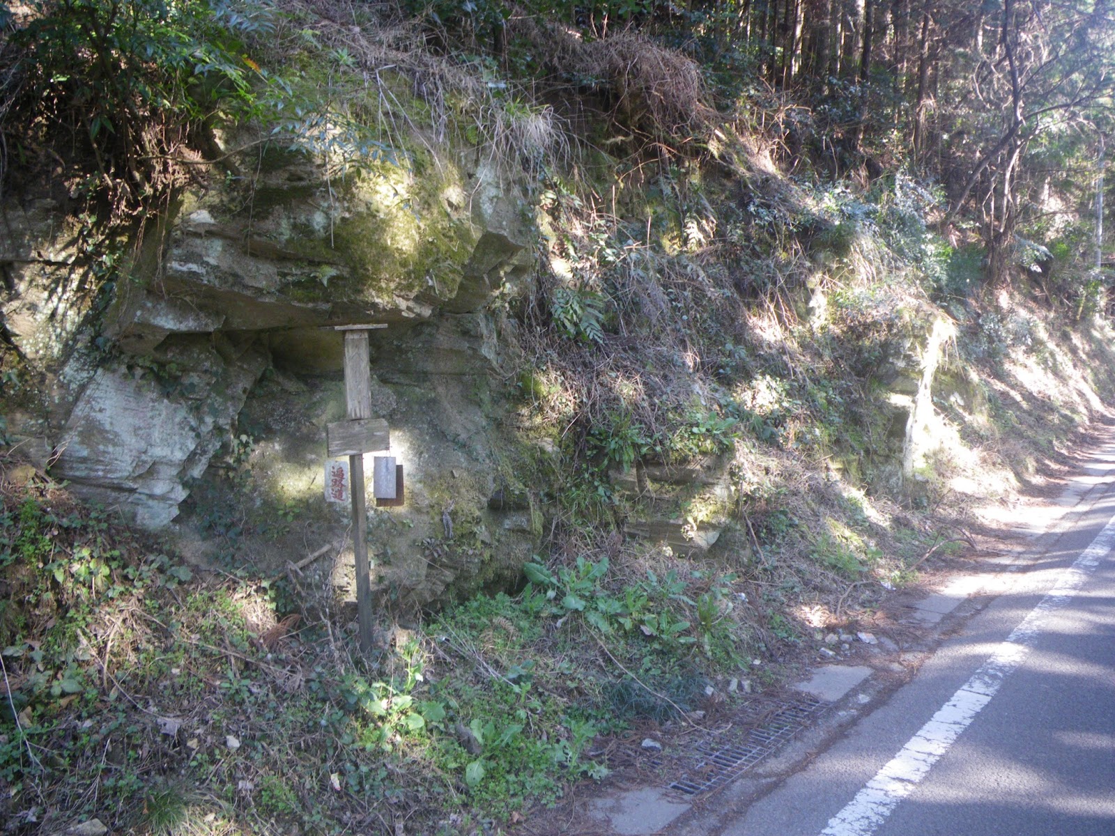 小田の町を抜け、県道に出る。「えひめの記憶」には「船戸にある参川(さんかわ)口のバス停前の右山側には舟形石仏などが多数並べられている。「二百十八丁」「二百十三丁」「二百九丁」「二百七丁」「二百五丁」などのほか判読できないものもある」とのこと。