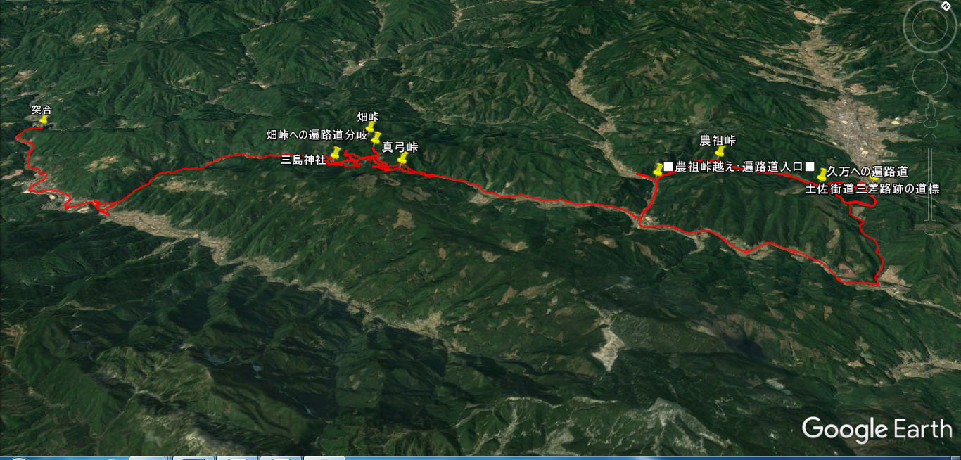 真弓峠越えは険路のため、昭和11年(1936)旧国道に隧道が掘られるまでの遍路道は、畑峠から田渡川の谷筋にある三島神社に向けて下り、下坂場峠を越えていったようである。