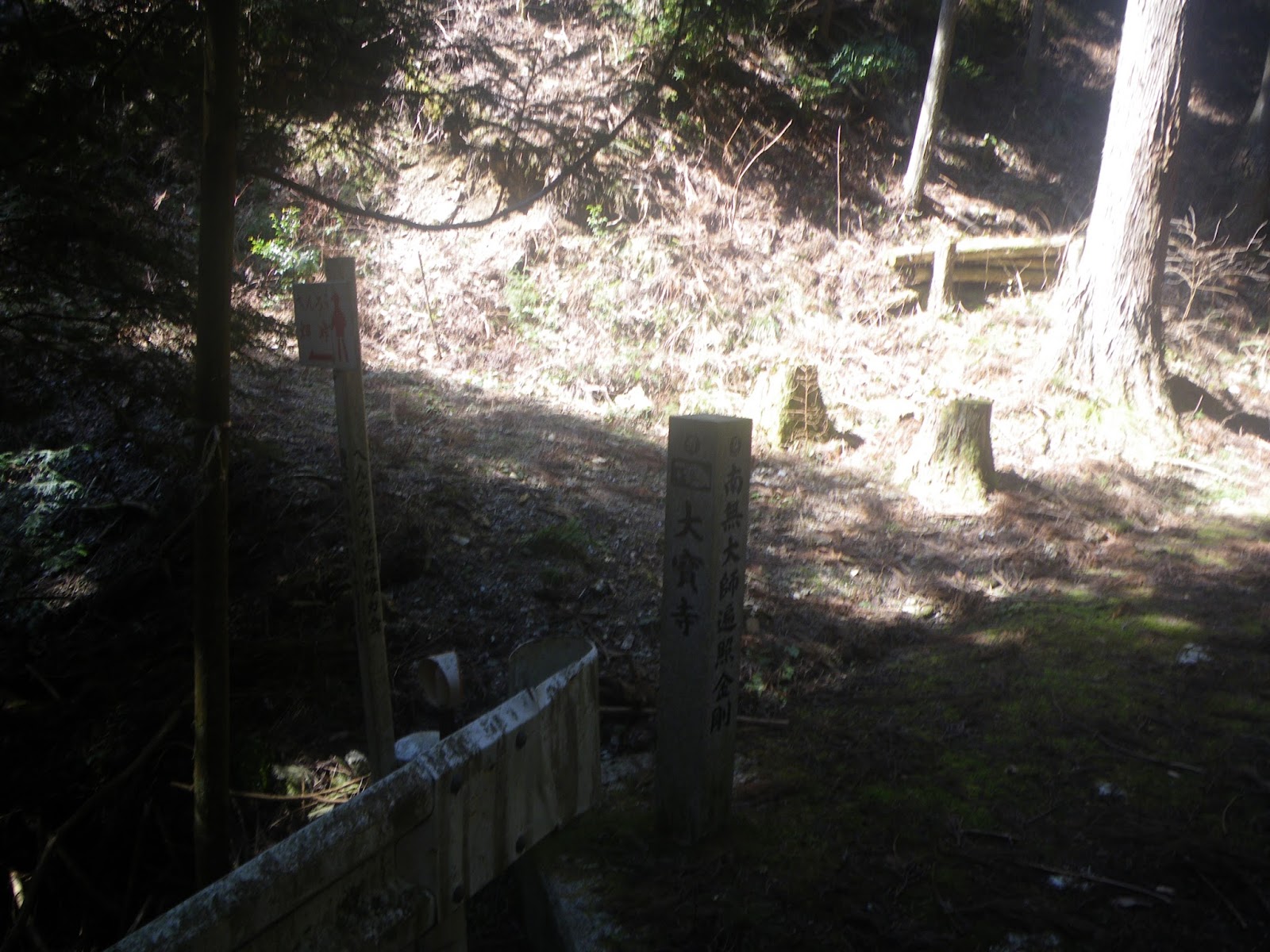 道に沿って流れる沢を見遣りながら、誠にゆるやかな坂をのんびり進む。12分程度進んだところで、「大宝寺」と刻まれた石柱の手印に従い、沢筋を更に進む。