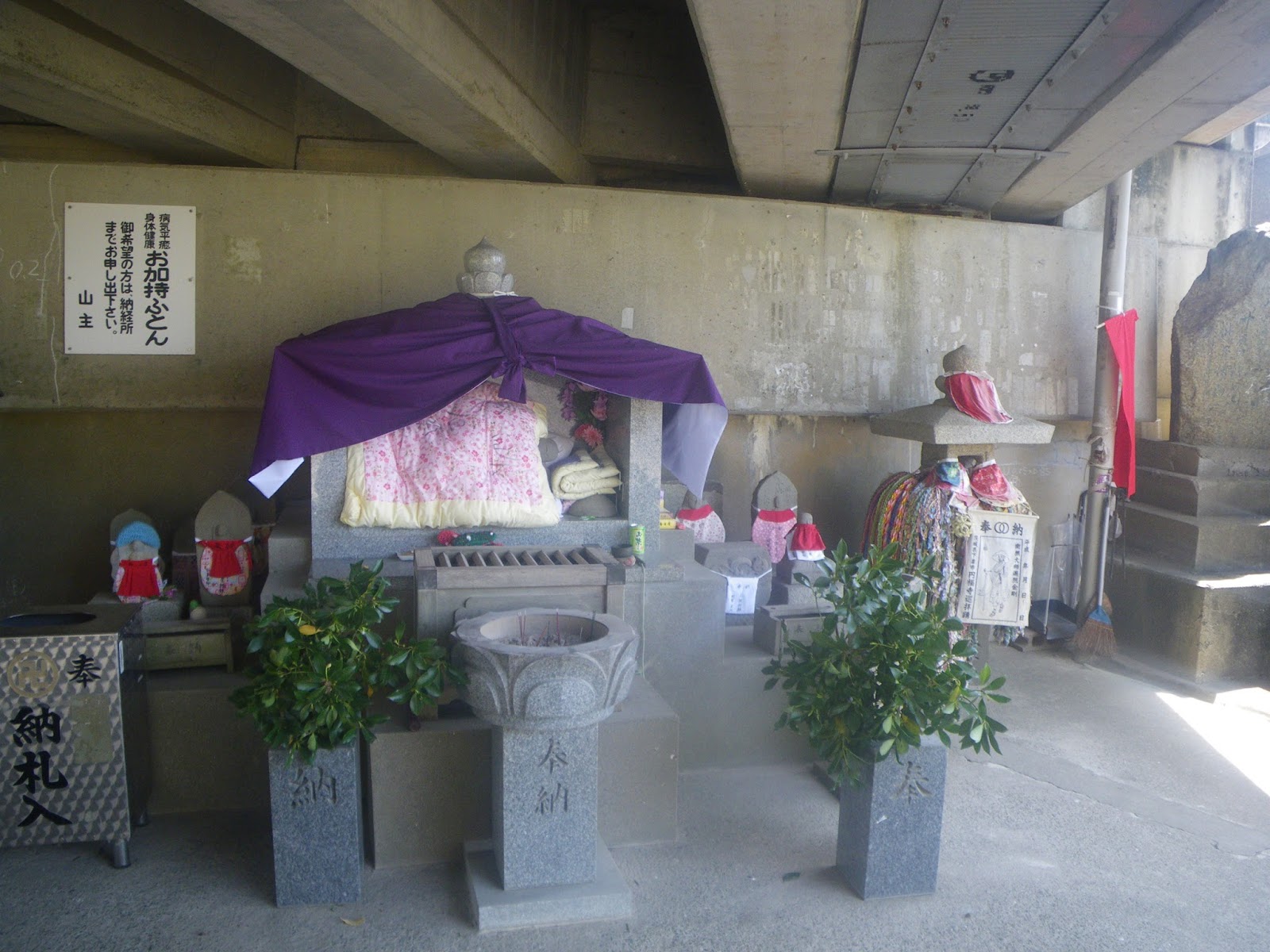 都谷川に沿って北に進み、国道56号と交差する橋の手前に道標が立つ。「へんろ道 すごう)山 十二里」「左 長濱道」と読める。道標から橋の下に。横たわるお大師さんに御布団をかけてある。
