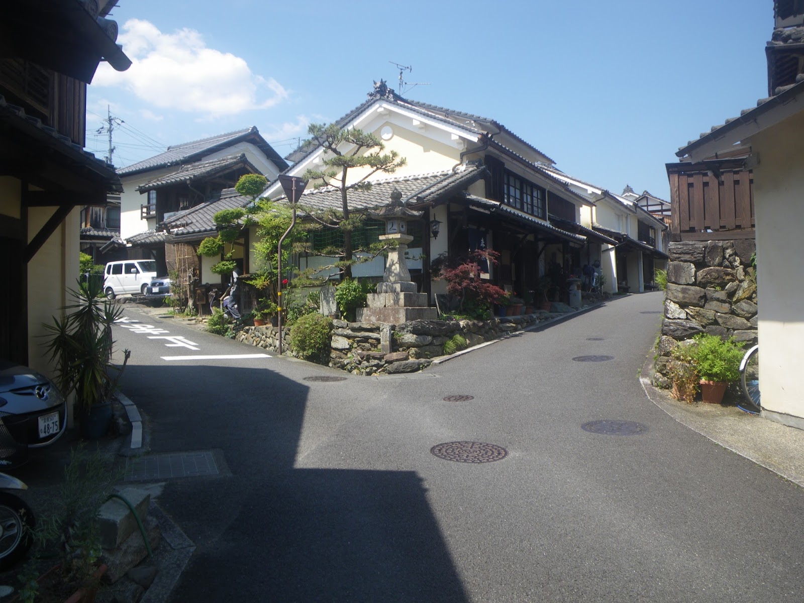 どちらに曲がればいいものやら?畑仕事をしていた方に、新谷古町三差路の目安となる中江藤樹の頌徳碑の場所を尋ねると、運よくその方の自宅前とのこと。「道を左に曲がり、松山道に沿って東に進むと、フットサルの練習場がある。その南側の道を進むと旧国道にあたる。そこを少し先に進み、理髪店の角を右に折れ、道なりに進むと中江藤樹の頌徳碑のある三差路に出る」と御親切に地図を書いて頂いた。