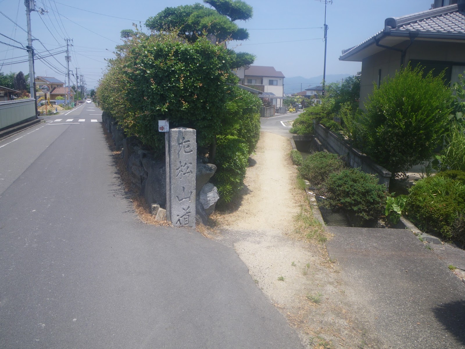 県道194号に戻り、北に進むと大宮八幡神社の南を東西に延びる道が県道194号と交差する箇所で、県道から右に分岐する径がある。その三差路に道標が建つ。「左 松山道」と刻まれ、遍路道は手印で示される。
