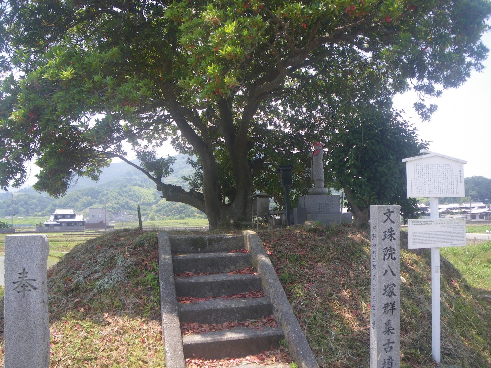 道を進むと、道脇に塚があり塚の上には木が茂る。塚の前には「文殊院八塚群集古墳」と刻まれた石塔と案内。「ここから西方の松山平野の南丘陵部には、土壇原(どんだばら)、西野、大下田南、釈迦面山等の古墳群が数多くあり、八ツ塚はそれらに続く平野部に位置する八基の群集古墳である。