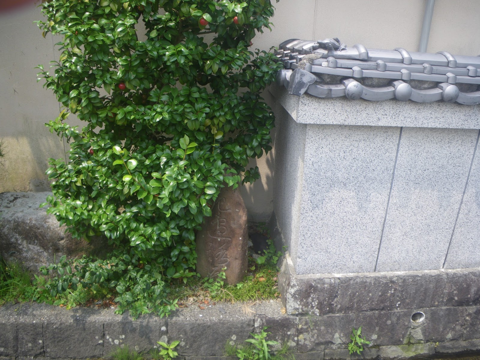 このお屋敷の東南角に道標があるという。生垣に埋もれ少し見えにくいが道標があった。「嘉永二年」「是より金毘羅街道」といった文字が読める。西から邸宅前まで延びる道路が「讃岐街道」と地図にあるので、往昔の金比羅道の道標かもしれない。