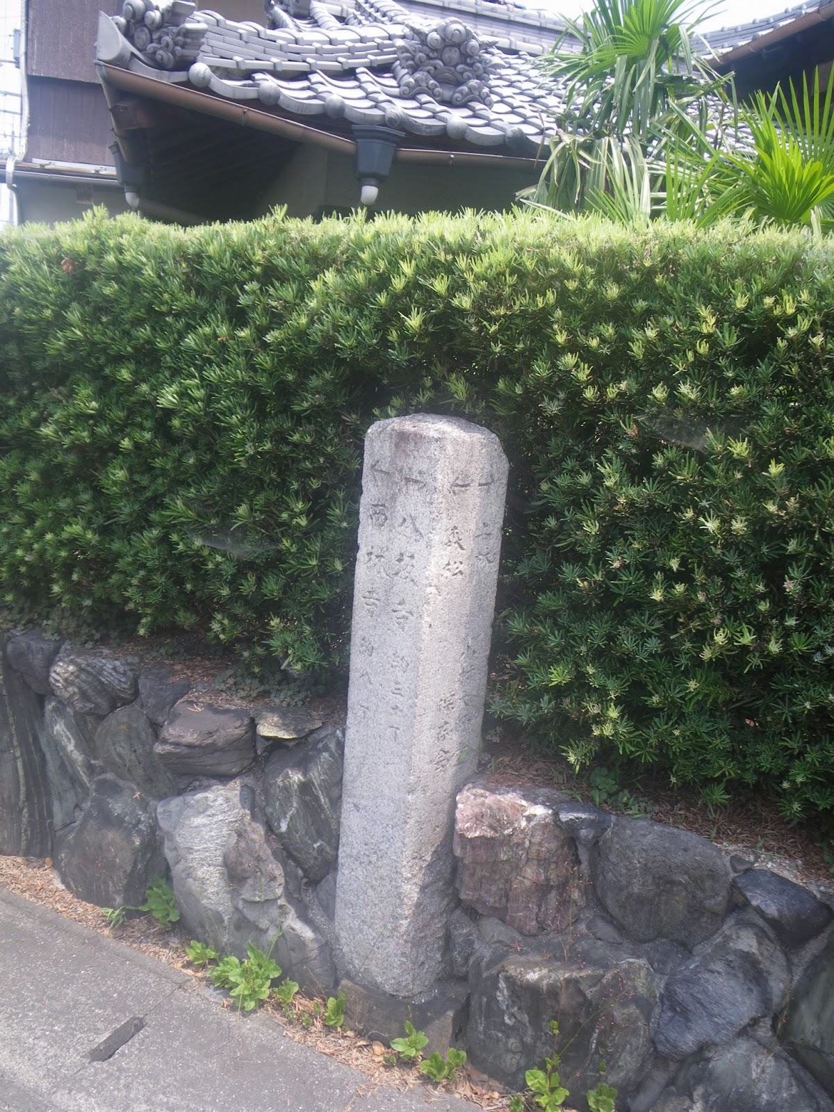 八坂寺近く、県道194号の道端に「松山札ノ辻より三里」と刻まれた里程標が建つ。結構新しい。レプリカではあろう。松山市内本町三丁目の電停辺り、かつて「札の辻」と称されていた高札場から土佐街道を進む目安とした里程標である。