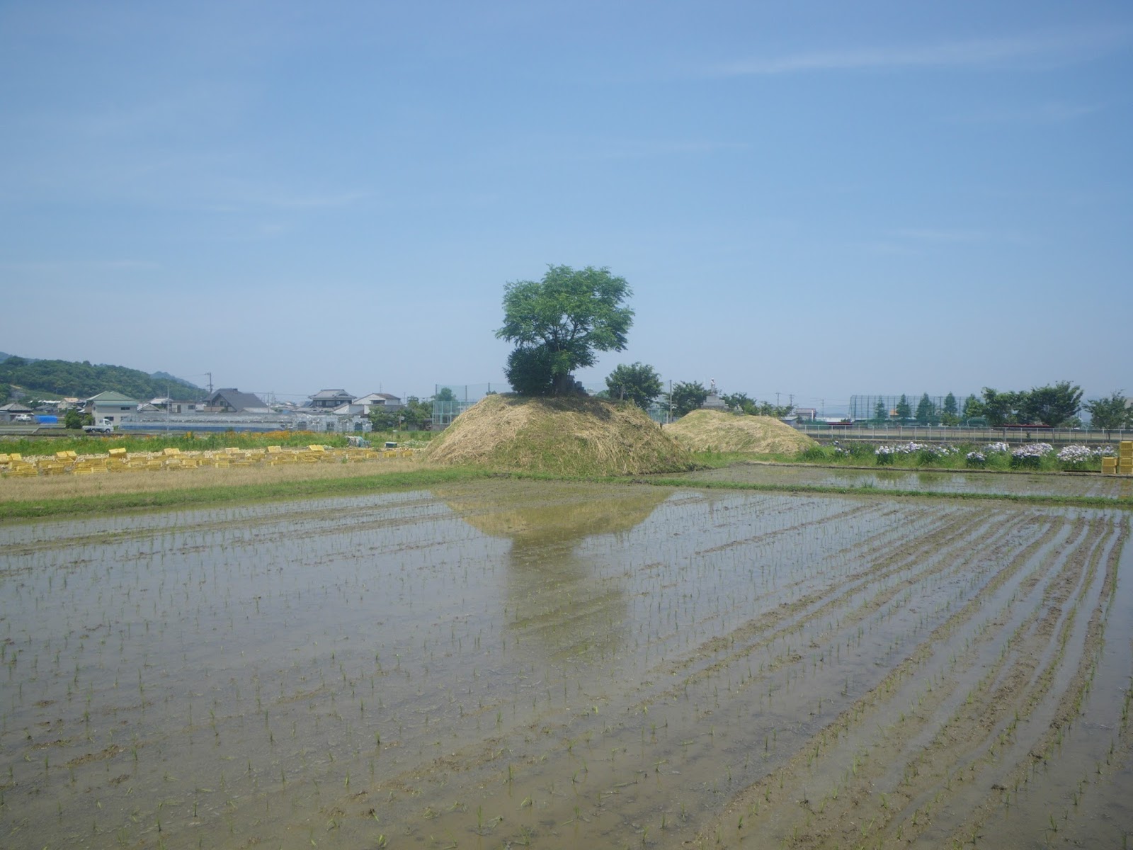 その他の塚は何処に?辺りを見廻すと、塚から北に進む水路沿いの道に木々の繁ったこんもりした塚らしきものが見える。とりあえず北に道を進み、これが古墳?などとちょっと不安になりながらも、先に進むと田圃の中に小さいけれども、如何にも古墳といった塚が幾つか続く。田圃の緑と、そこに浮かび上がる塚の緑とそこに茂る木の緑は誠に美しい。