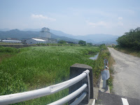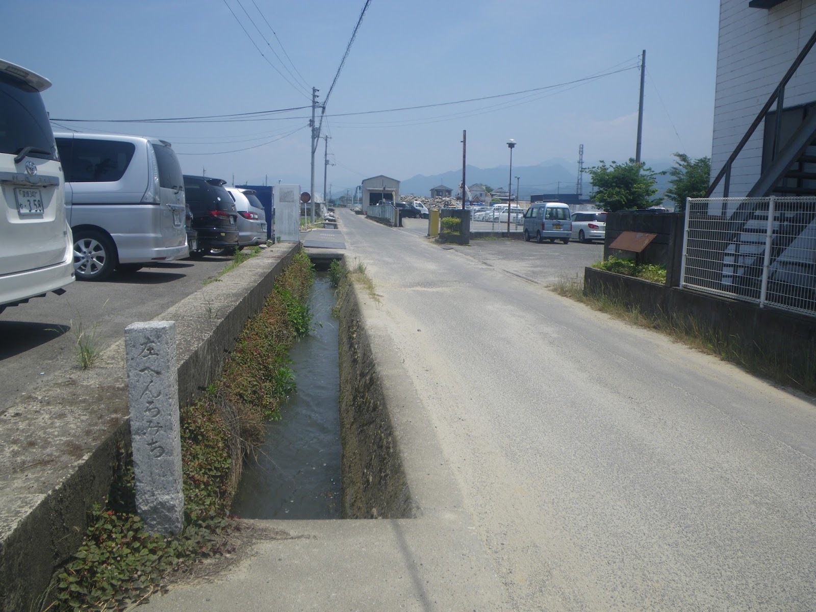橋を渡り、「えひめの記憶」に「遍路道は、大正橋で御坂川を渡り、左折して田んぼ道をしばらく進むと、建立者が米寿を記念して建てた「左へんろみち」と刻まれた道標がある」とする道標を探す。