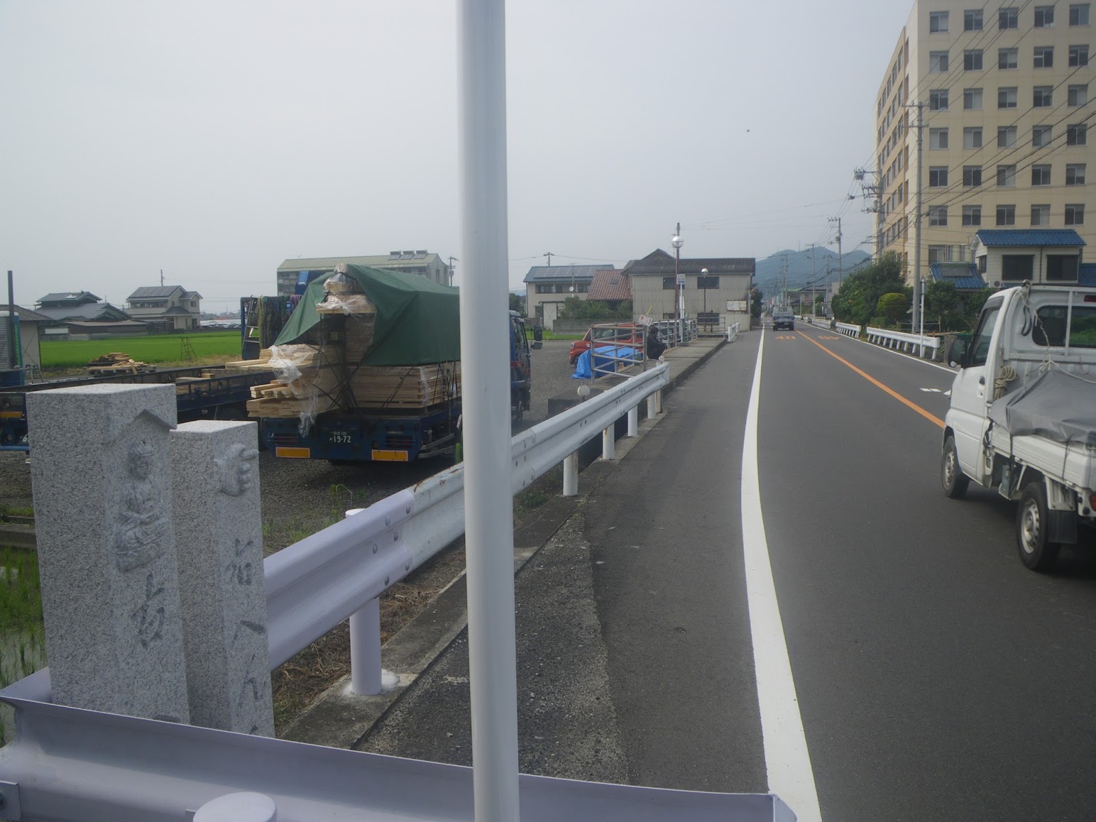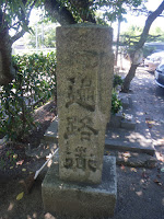 参道を南に下り、県道187号沿いに立つ鳥居の県道南西に茂兵衛道標があった。上にメモした、明治28年(1895)ころ道後駅から、城北に向かい走っていた軌道車の線路沿いを、この樋又の護国神社鳥居前に立つ茂兵衛道標(私注;後述)につながり、そのあと南海放送会館前(私注;現在の本町会館と異なり、昭和39年に道後樋又に建設された南海放送会館のことだろう)から大川沿いの本道に出る、いわゆる脇道の遍路街道に建っていた、ということだろう。