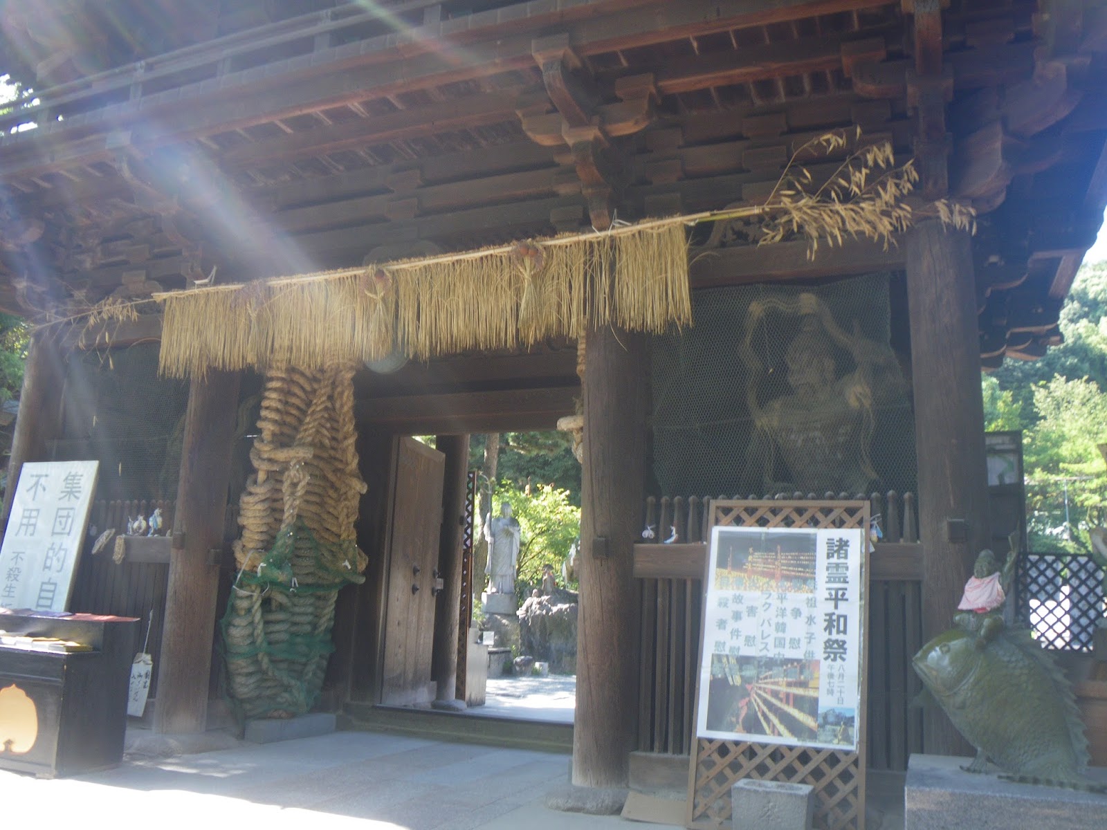 石畳の参道を進むと仁王門。大きな草鞋が遍路の安全を守る。高さ7m、間口は三間、横4m、文保2年(1318)の建立、二層入母屋造り本瓦葺きのこの門は国宝に指定されている。