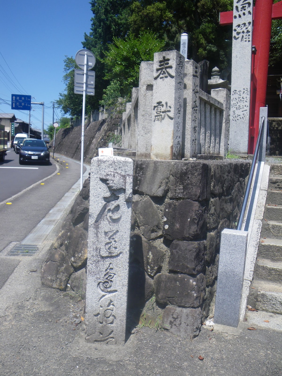 社の南東角、県道334号(旧国道11号)から県道40号が北に分かれる箇所に立派な道標が立つ。手印は西と南を指す。なんとなく手印の示す方向が前の浄土寺とも次の繁多寺とも合わないのだが。はてさて。