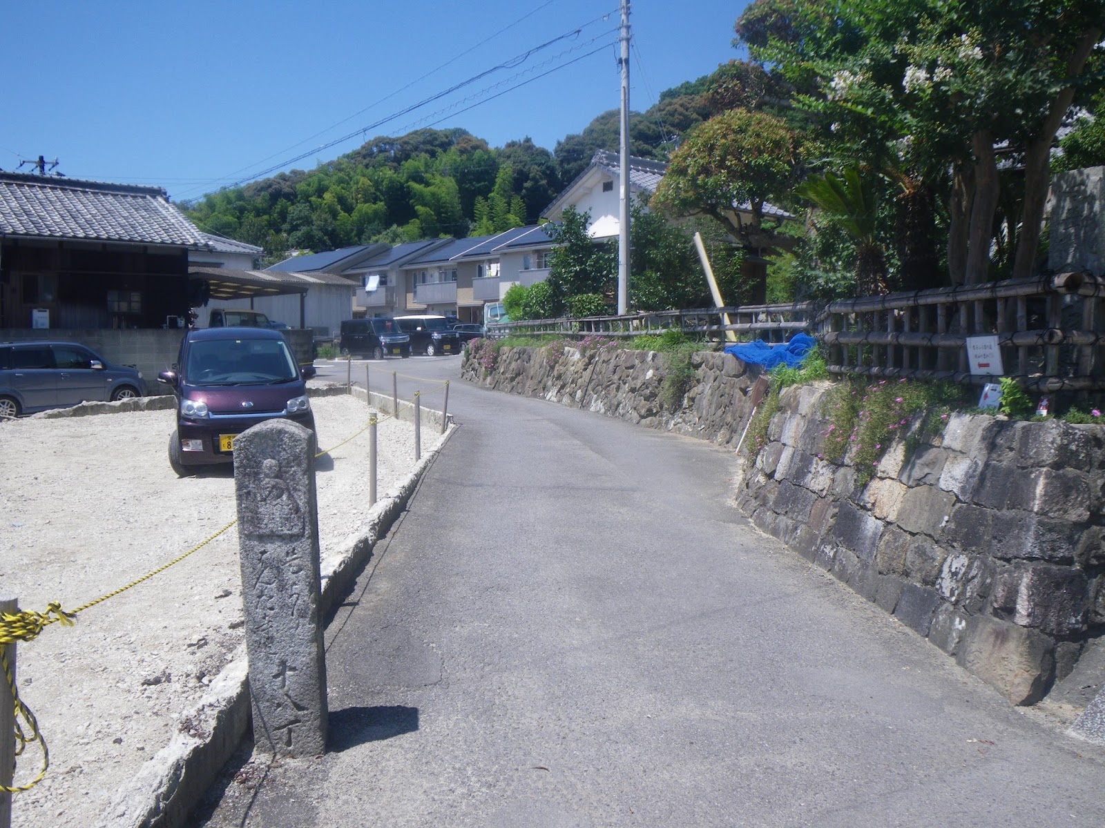 遍路道は仙波石材店の標石手前で県道40号とわかれ右手に入る。坂を上り切ったところで久米霊園にあたる。遍路道は車通行止めと記された霊園中をほんのわずかの距離を進むと、霊園から住宅街の道に出る。