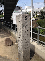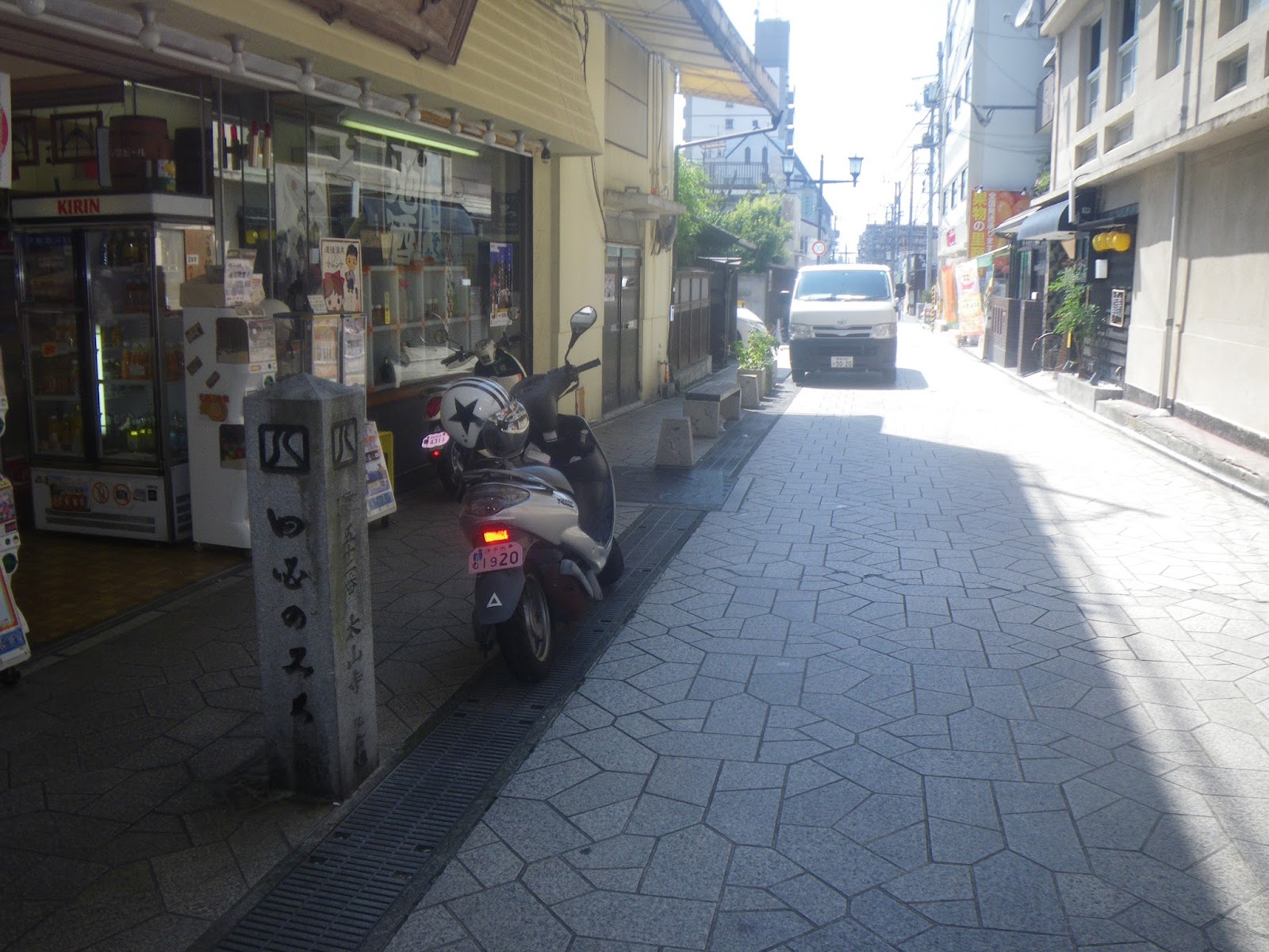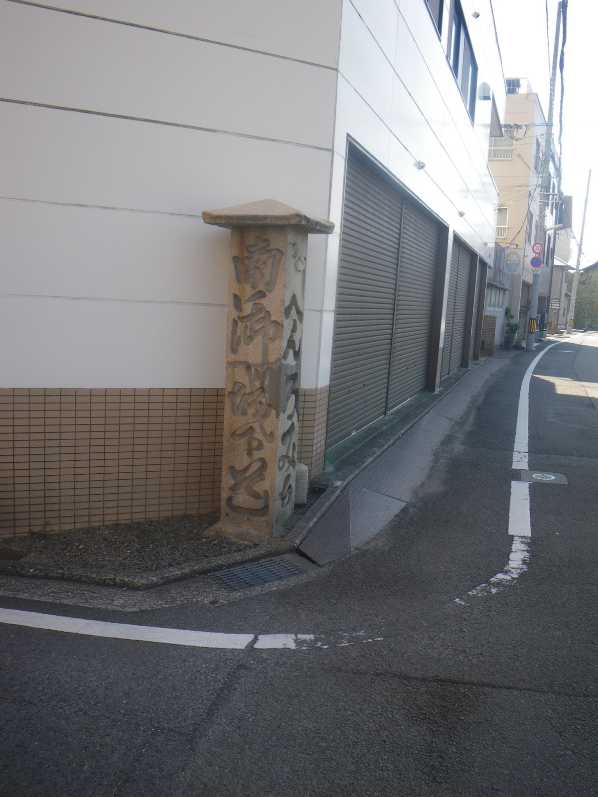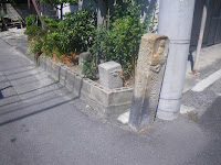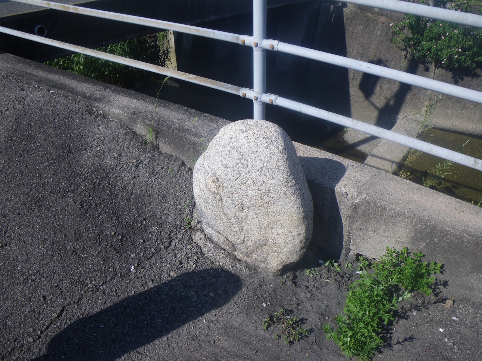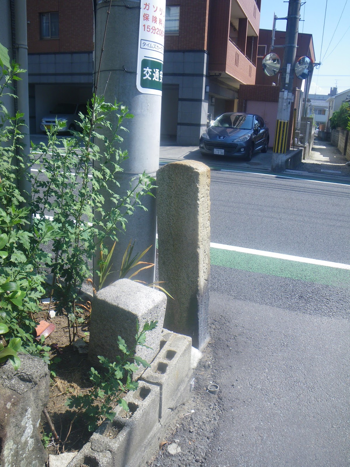 なお、椿湯の西約40mのところにかつて木賃宿「筑前屋」があり、その前に1本の道標が昭和47年(1972)まで立っていたという。これには「(手印)太山寺道/(梵字(ぼんじ))為三界萬霊」と刻字され、筑前屋の前を西に進み太山寺へ向かうよう指示していたという。道は筑前屋の右脇を北に進んで左折、大川沿いの遍路道に向かっていた。この道が大川端に出る所は、前述の清水川沿いの遍路道が出てくる天神橋付近よりもやや上手であったようである(「愛媛の記憶」)」。大川、天神橋は後ほどメモする。